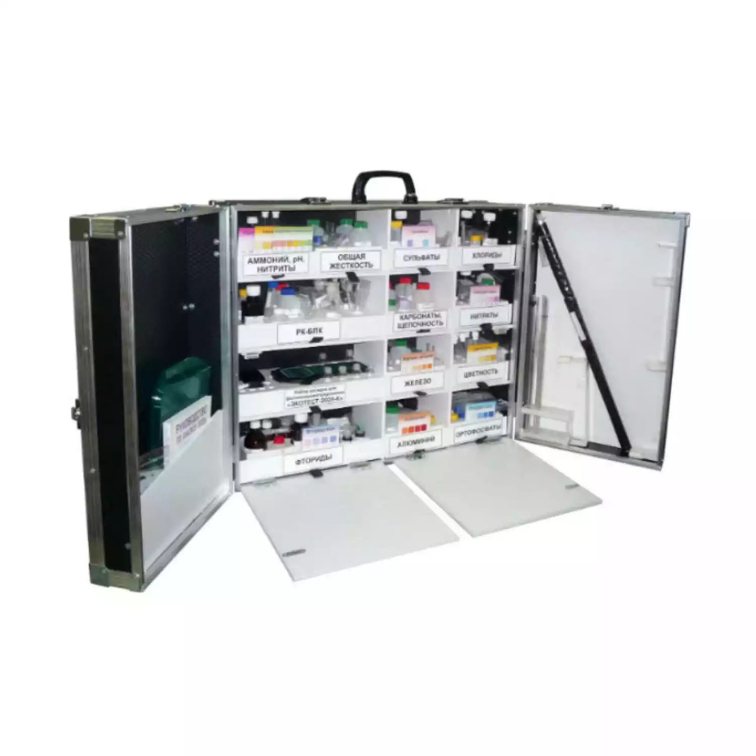 - Документация: профессиональное руководство по анализу воды, карты-инструкции для удобного использования оператором печатных материалов при анализе, паспорт на лабораторию, паспорта на приборы, опись комплектности укладки.