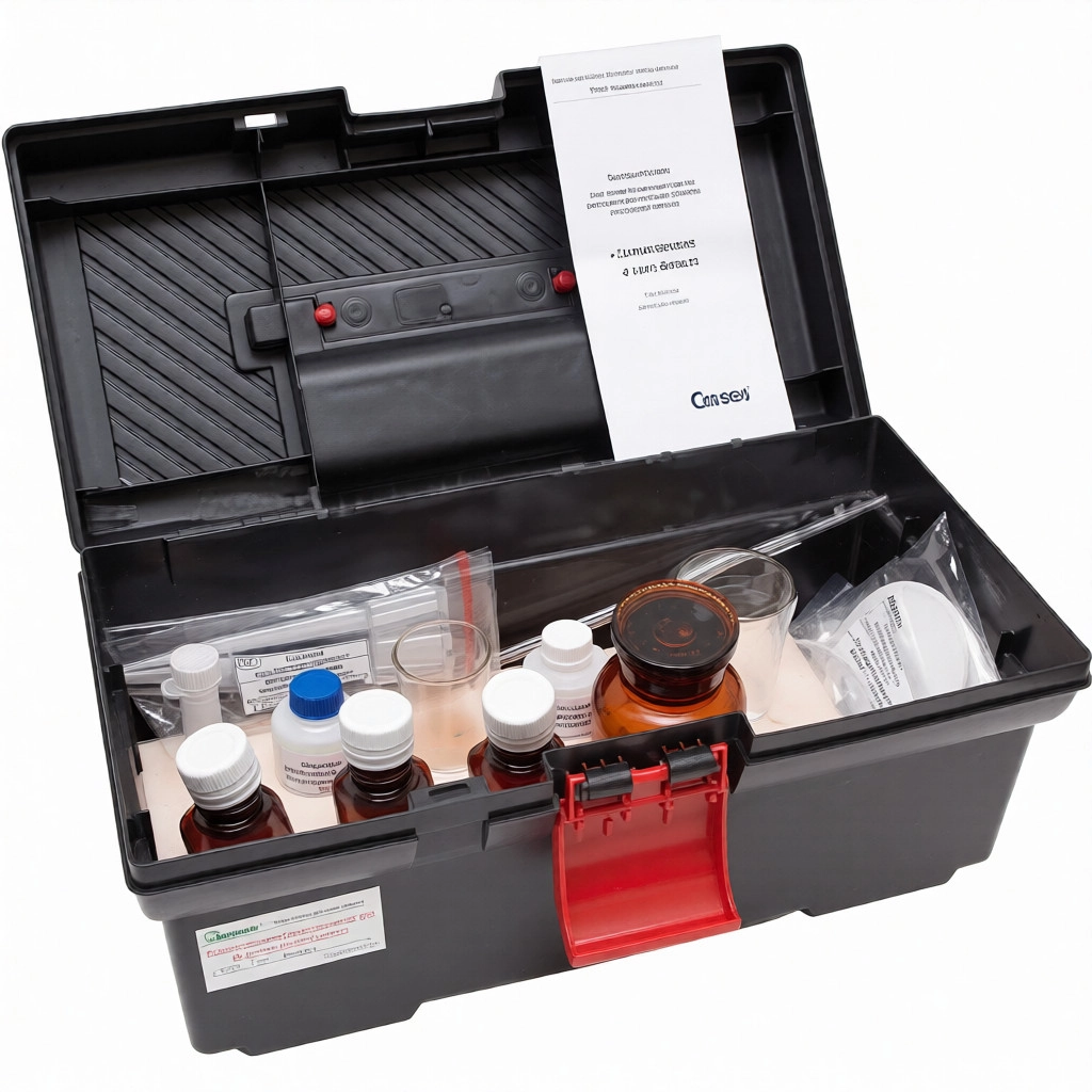 Тест-комплект «Сероводород и сульфиды» представляет собой удобный для переноски, транспортирования и хранения жесткий корпус-укладку, в который компактно размещены необходимые средства измерения, готовые растворы и реагенты, посуда и оборудование, документация.