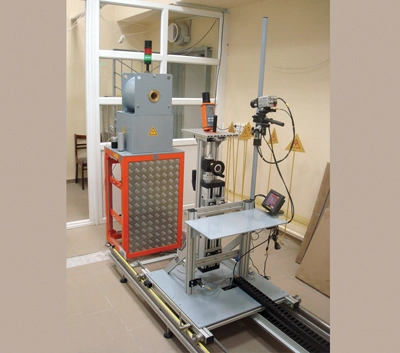 В установке реализуется схема облучения с неподвижным облучателем и линейно позиционируемой платформой калибровочного стенда. Диапазон значений мощности дозы гамма-излучения достигается применением источников 137Cs различной активности и изменением расстояния источник-детектор. Размер поля излучения варьируется расстоянием источник-детектор или диаметром канала коллиматора. Функции перемещения источника в облучателе и позиционирования подвижной платформы автоматизированы. Управление установкой осуществляется оператором дистанционно.