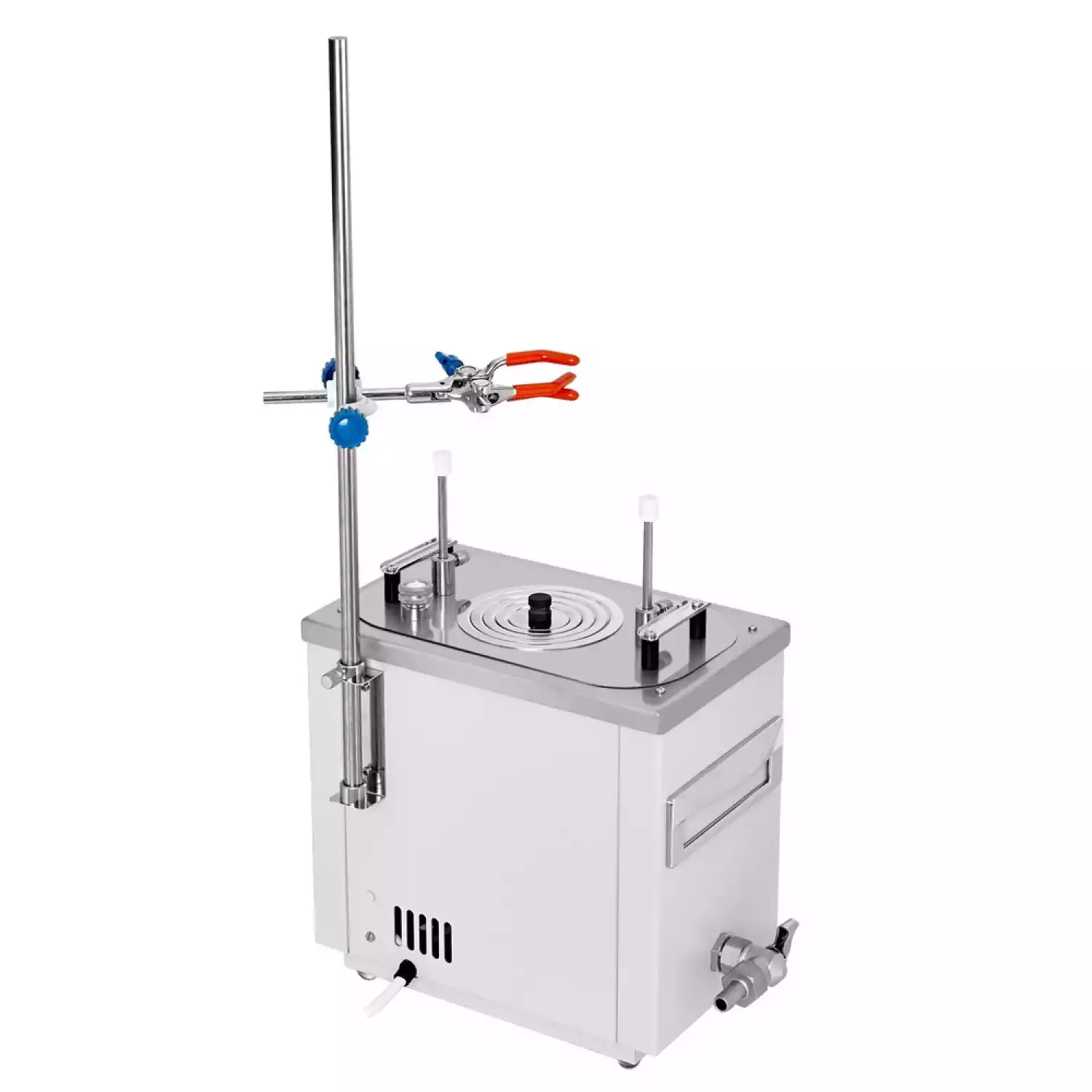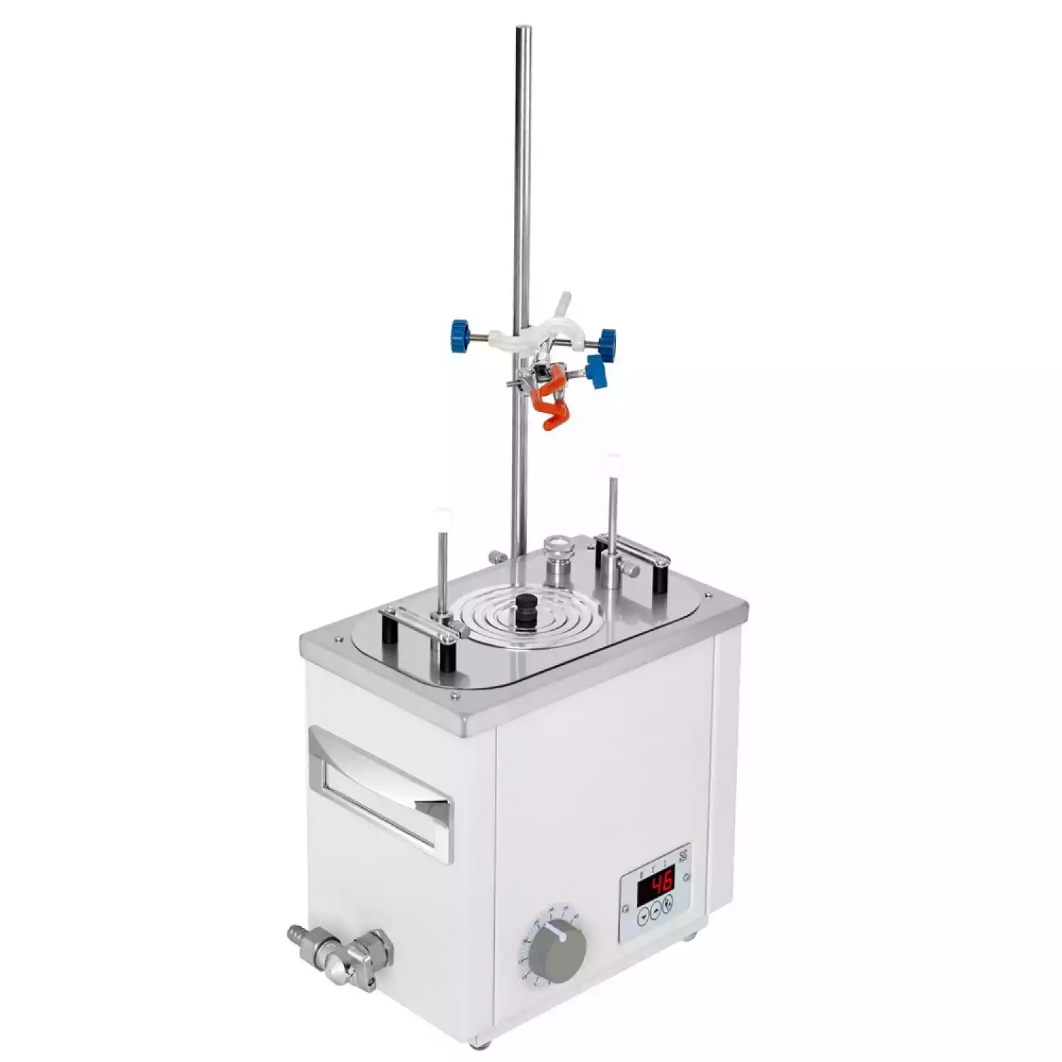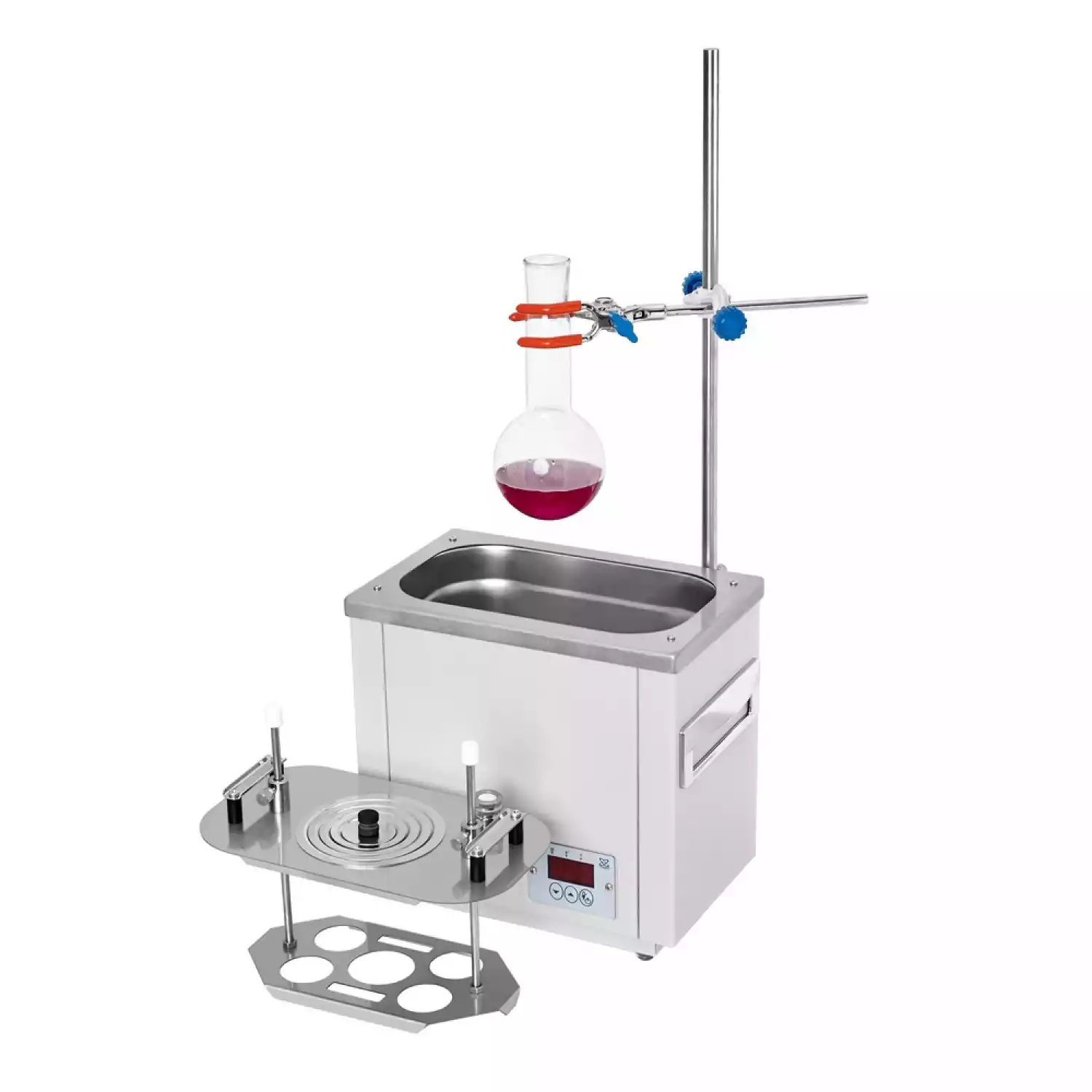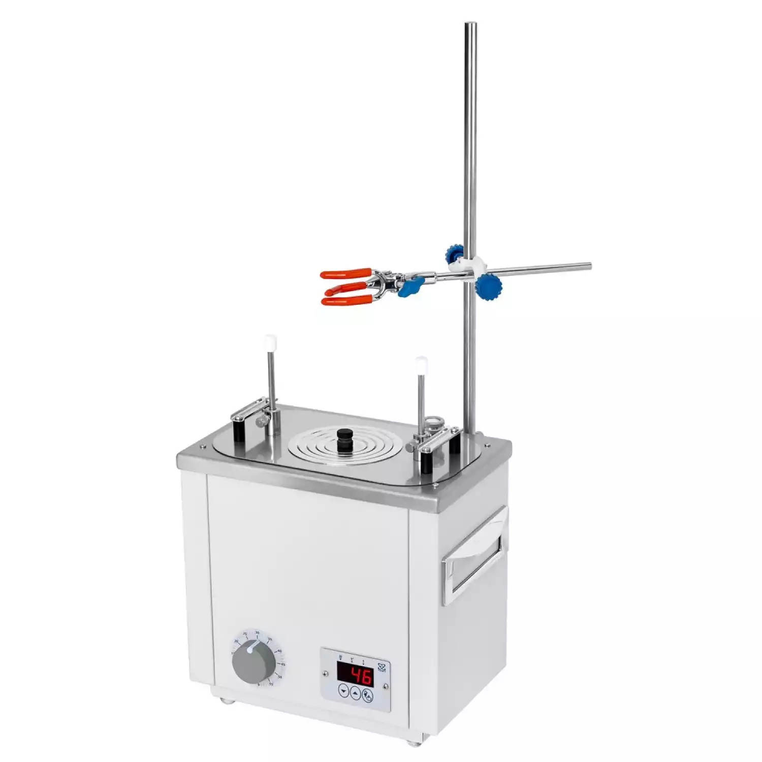Универсальная баня ЛБ12‑Ш оснащена легко извлекаемой корзиной с подвижным дном для размещения лабораторной посуды различного размера, стальными концентрическими кольцами для ее уплотнения, штативом и лапкой с зажимом.