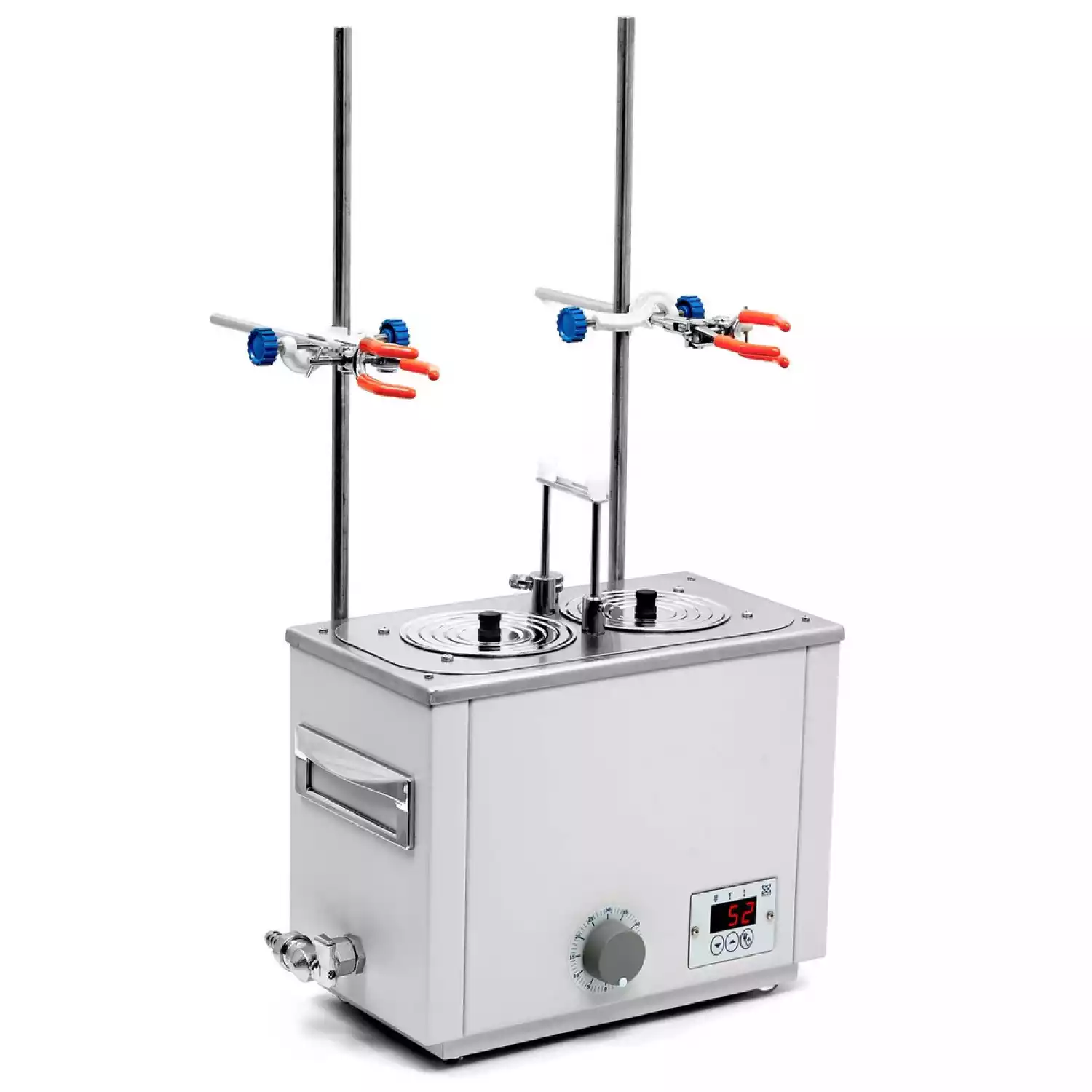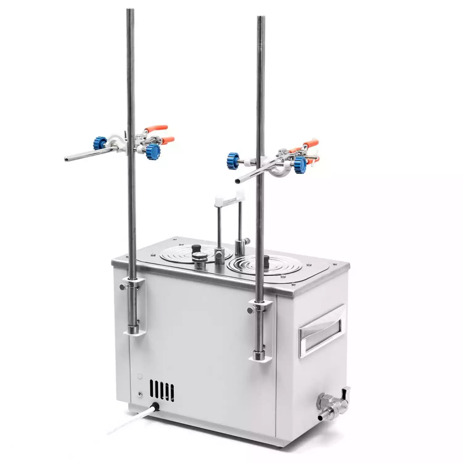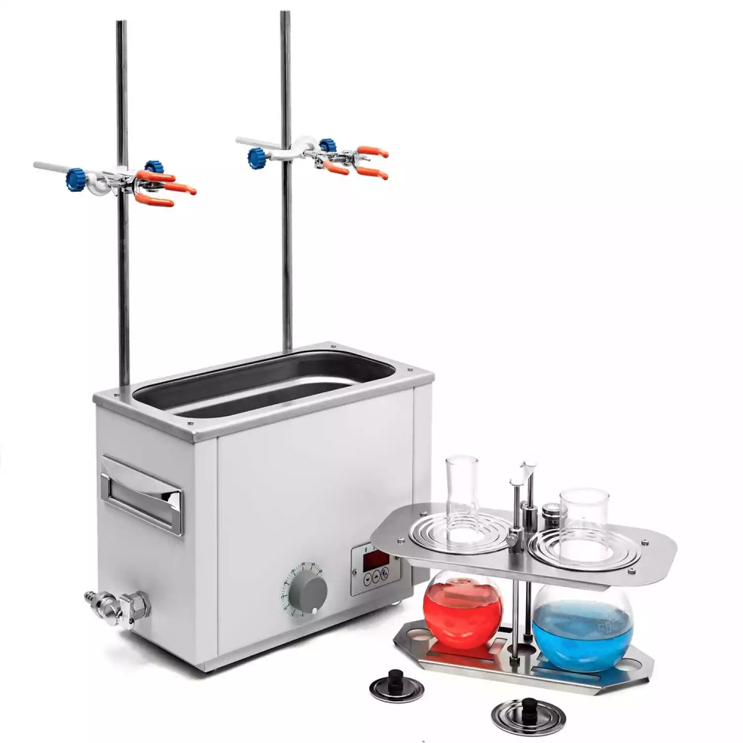 Универсальная баня ЛБ22‑Ш оснащена легко извлекаемой корзиной с подвижным дном для размещения лабораторной посуды различного размера, стальными концентрическими кольцами для ее уплотнения, штативами и лапками с зажимом.
