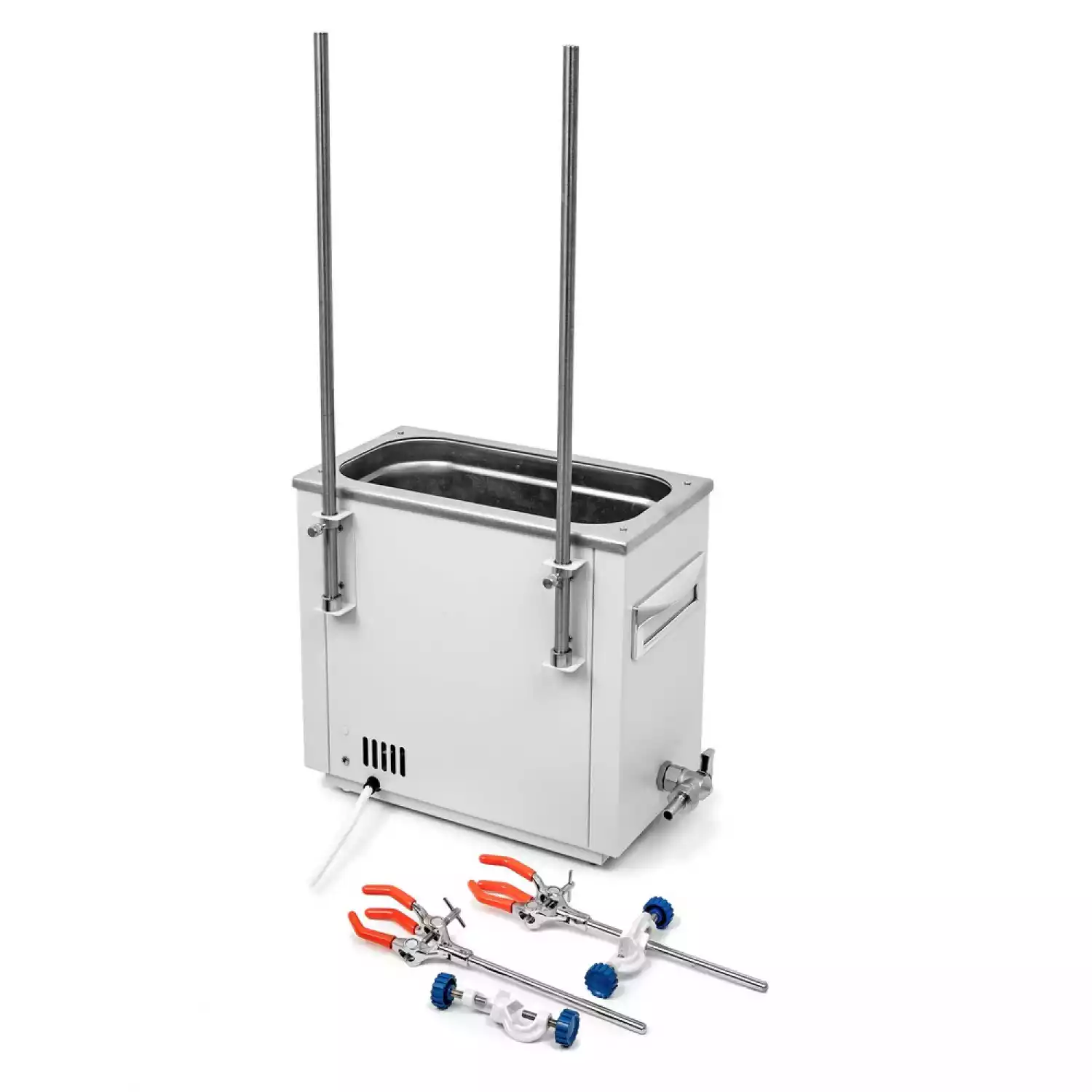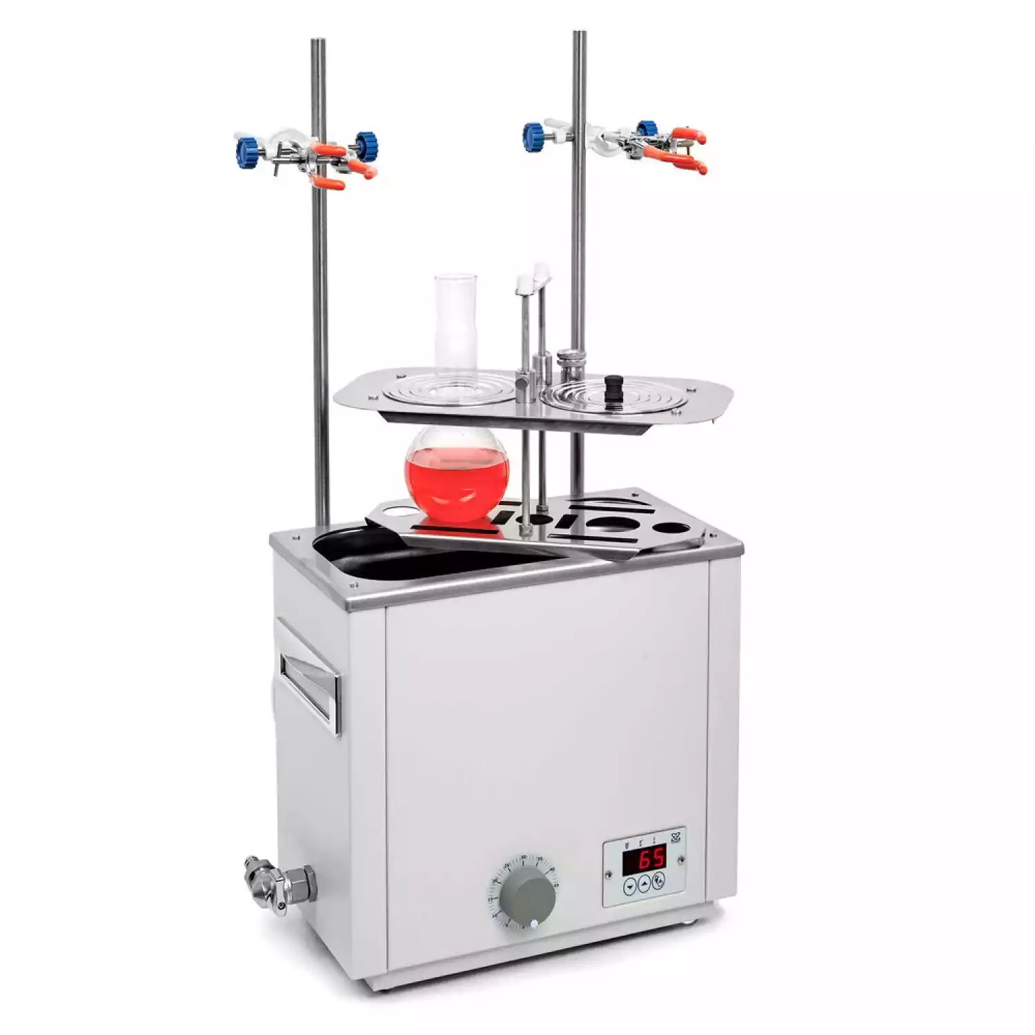 Универсальная баня ЛБ23‑Ш оснащена легко извлекаемой корзиной с подвижным дном для размещения лабораторной посуды различного размера, стальными концентрическими кольцами для ее уплотнения, штативами и лапками с зажимом.