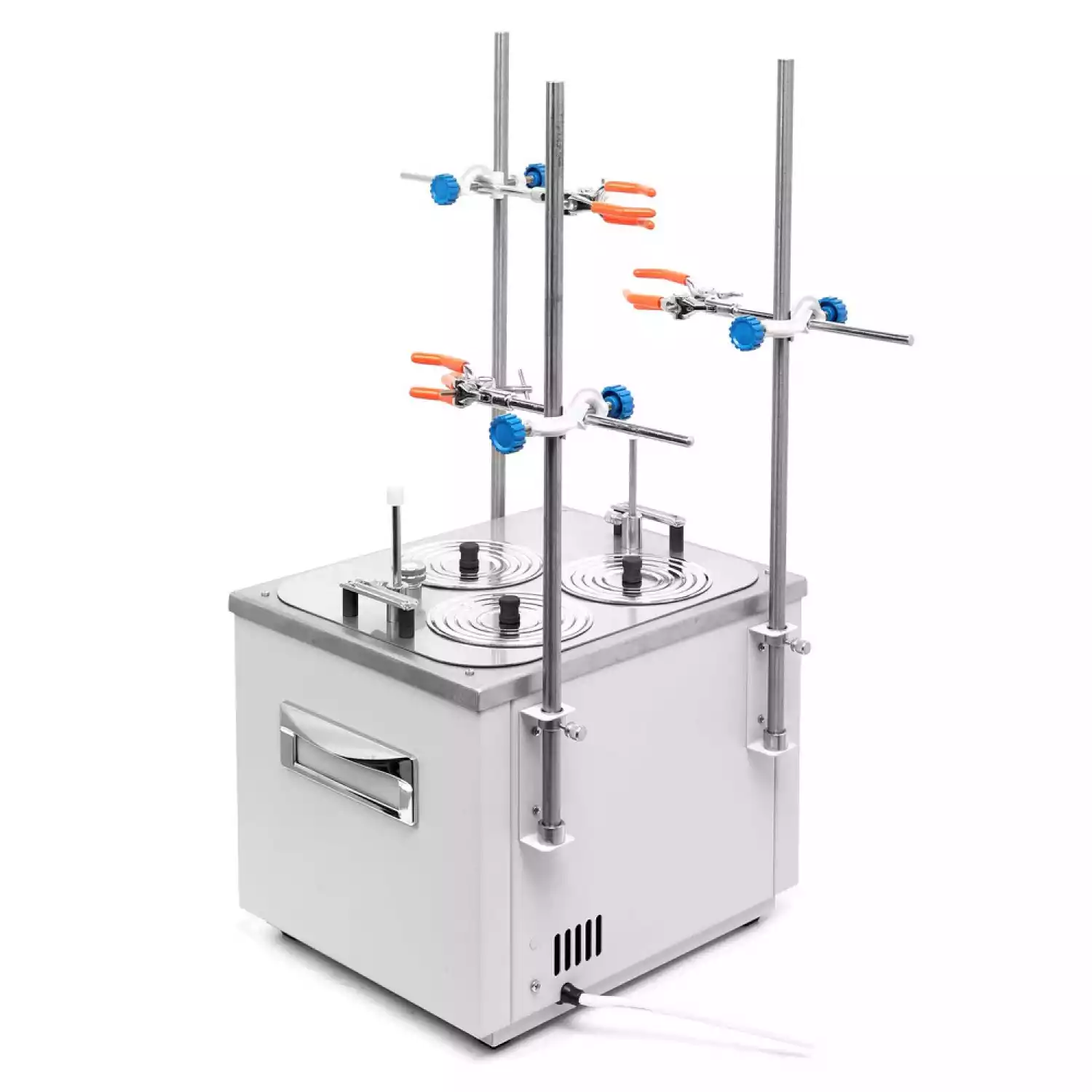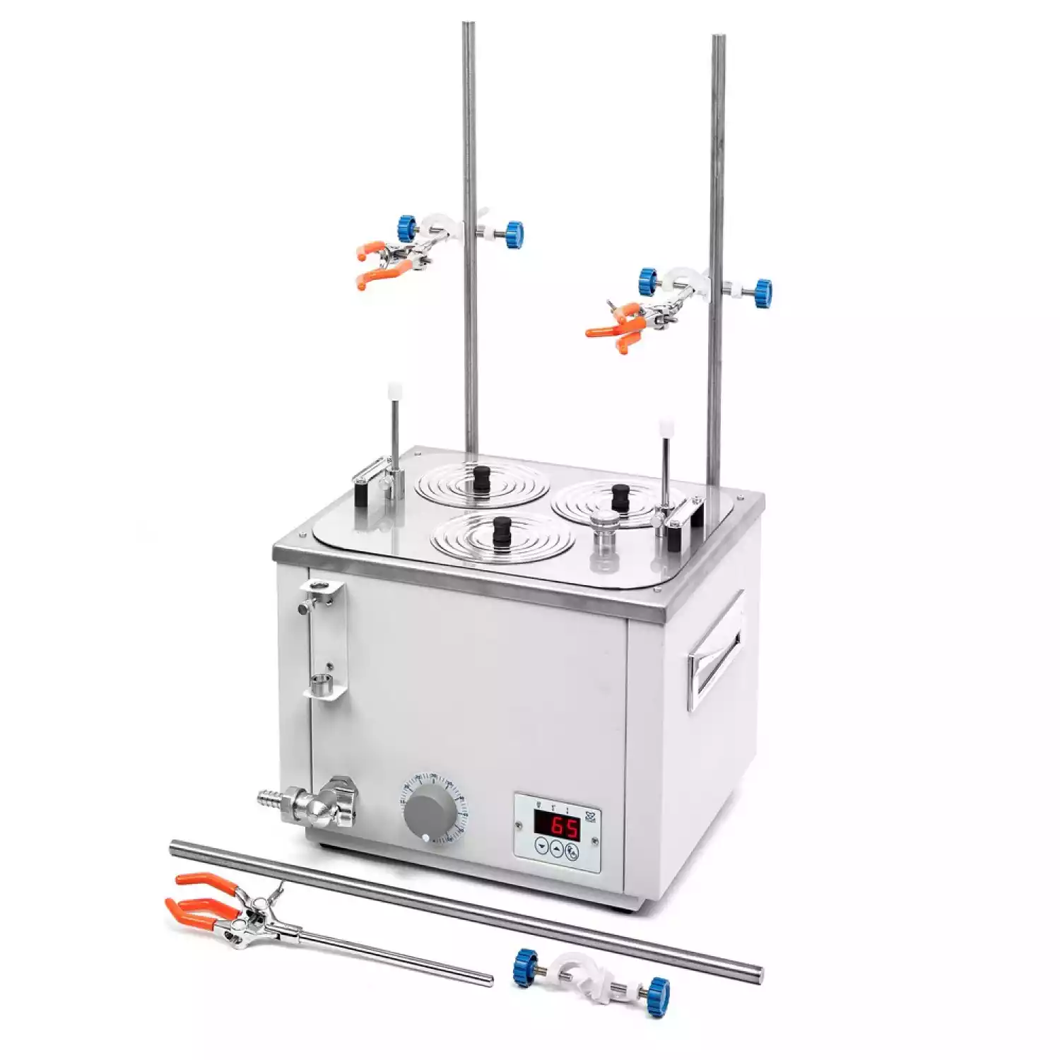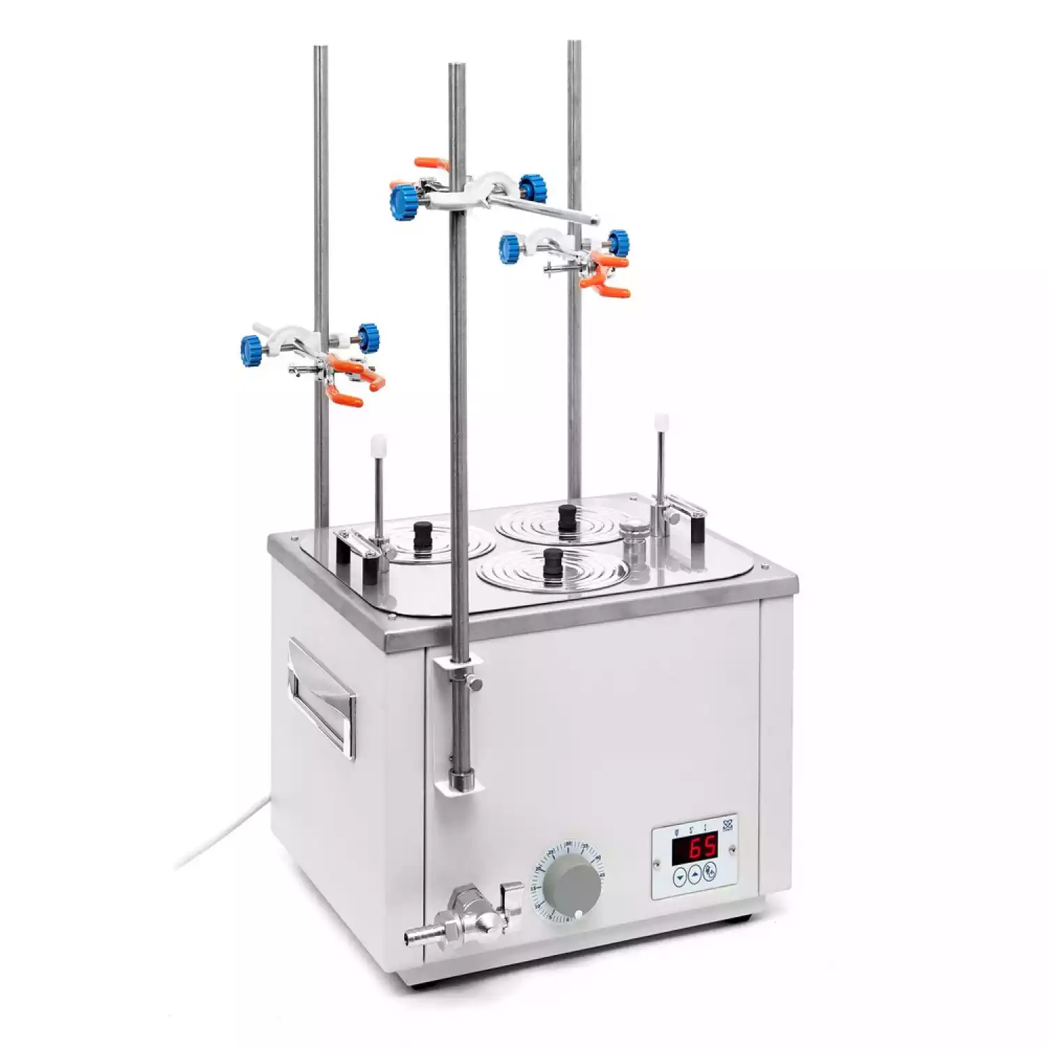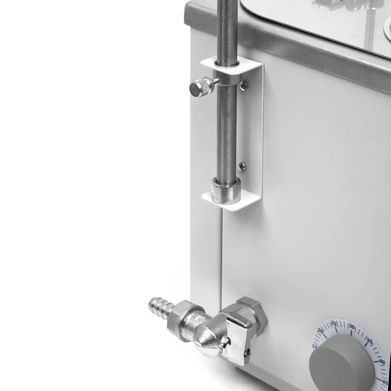 Универсальная баня ЛБ32‑Ш оснащена легко извлекаемой корзиной с подвижным дном для размещения лабораторной посуды различного размера, стальными концентрическими кольцами для ее уплотнения, штативами и лапками с зажимом.