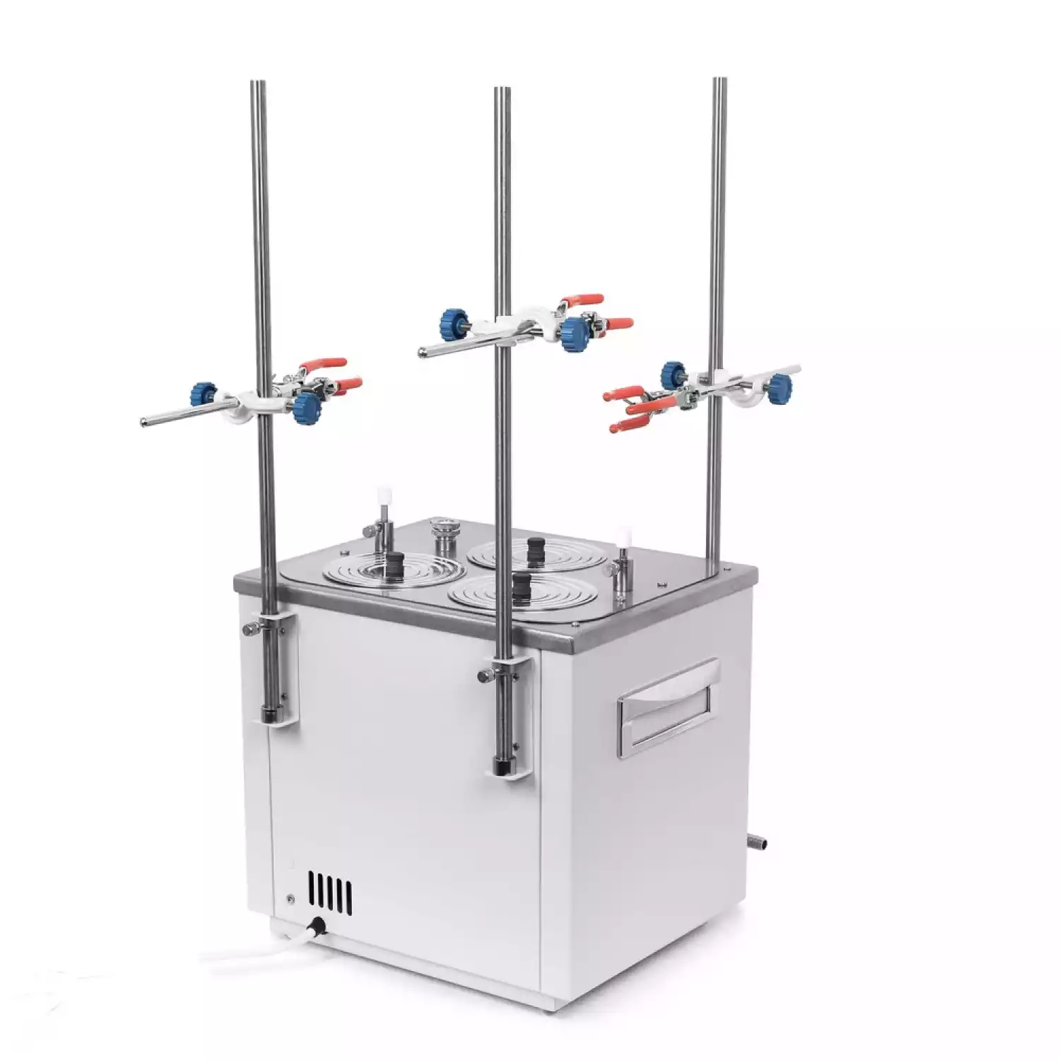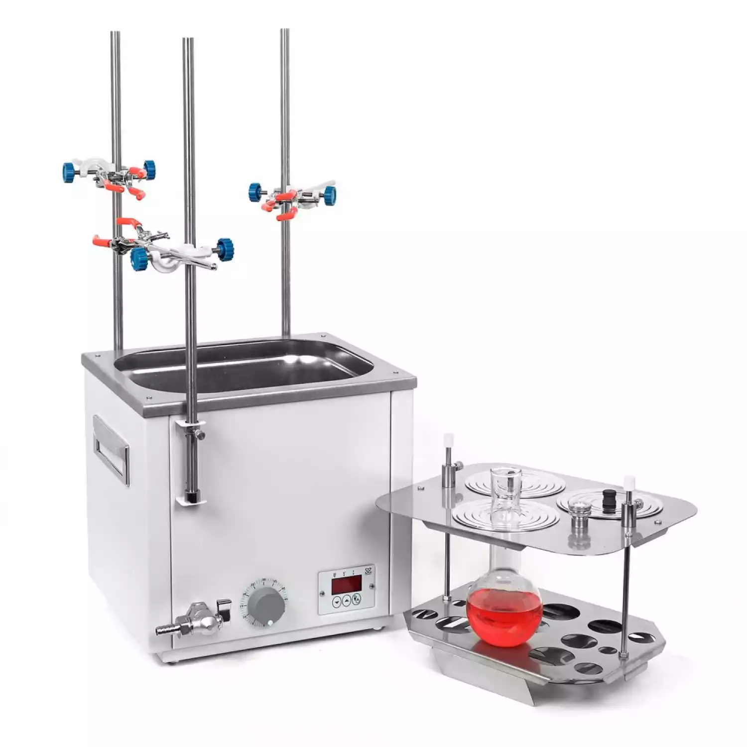 Универсальная баня ЛБ33‑Ш оснащена легко извлекаемой корзиной с подвижным дном для размещения лабораторной посуды различного размера, стальными концентрическими кольцами для ее уплотнения, штативами и лапками с зажимом.