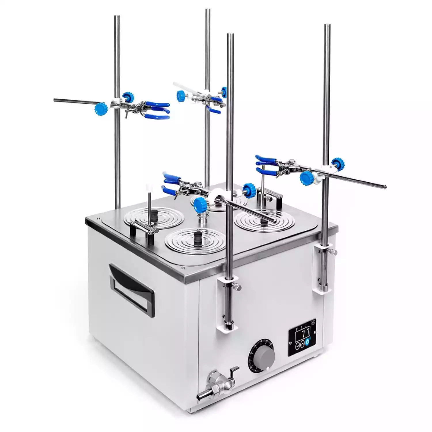 Универсальная баня ЛБ42‑Ш оснащена легко извлекаемой корзиной с подвижным дном для размещения лабораторной посуды различного размера, стальными концентрическими кольцами для ее уплотнения, штативами и лапками с зажимом.