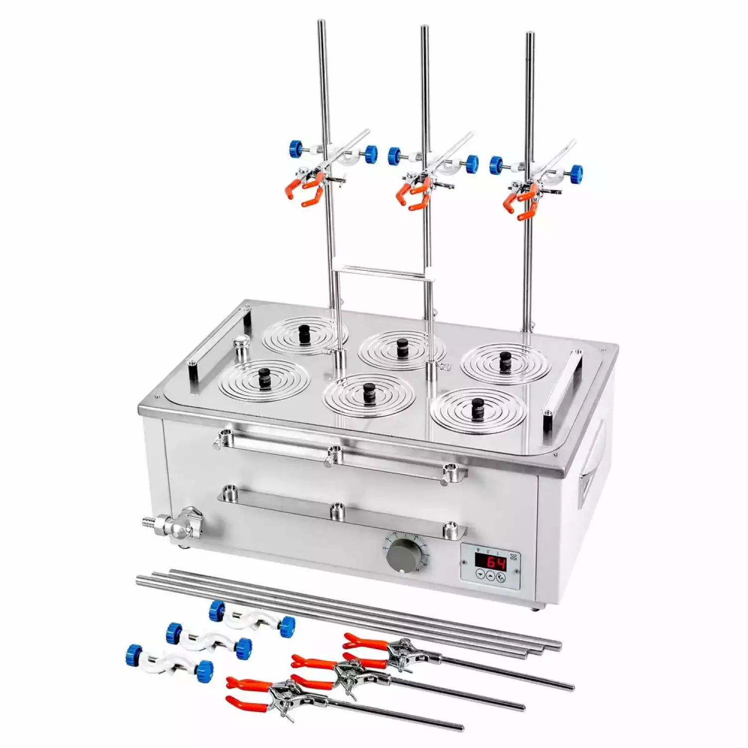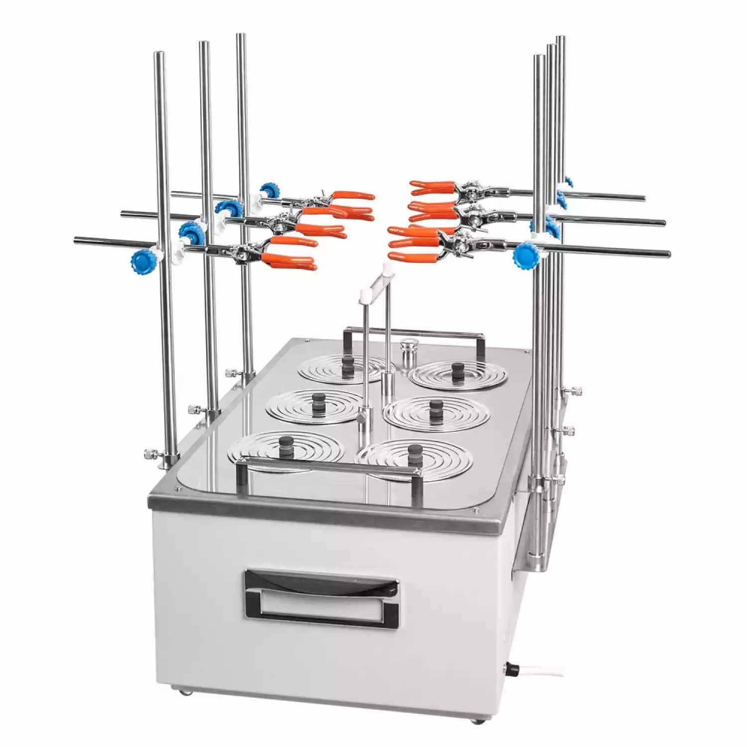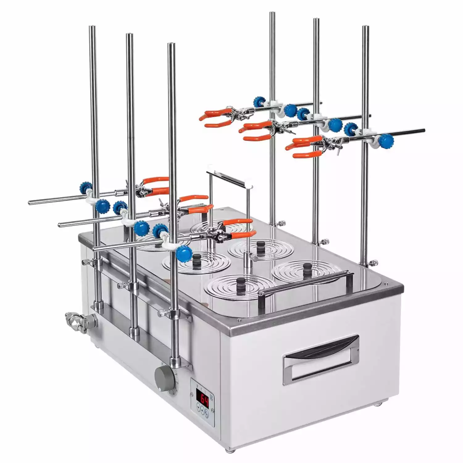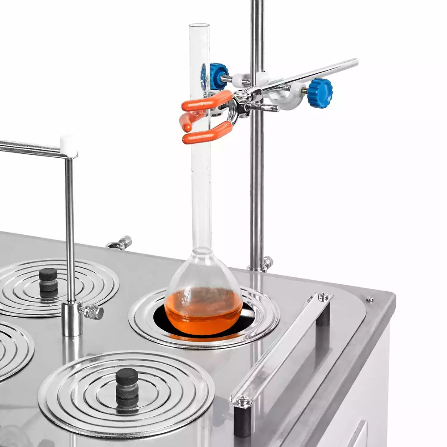 Универсальная баня ЛБ61-Ш оснащена легко извлекаемой корзиной с подвижным дном для размещения лабораторной посуды различного размера, стальными концентрическими кольцами для ее уплотнения, штативами и лапками с зажимом.