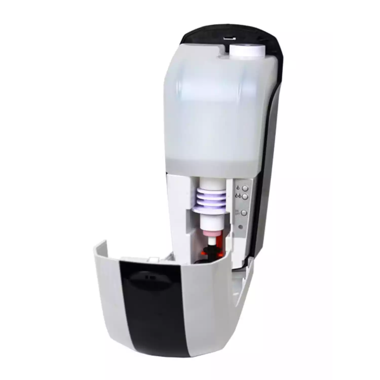 Оснащен встроенной ёмкостью на 1 литр с возможностью дозаправки, что позволяет избежать использования дорогостоящих расходных материалов в фасовке по 1 литру (как у локтевых дозаторов) и допускает дозаправку из более экономичных канистр на 5 литров.