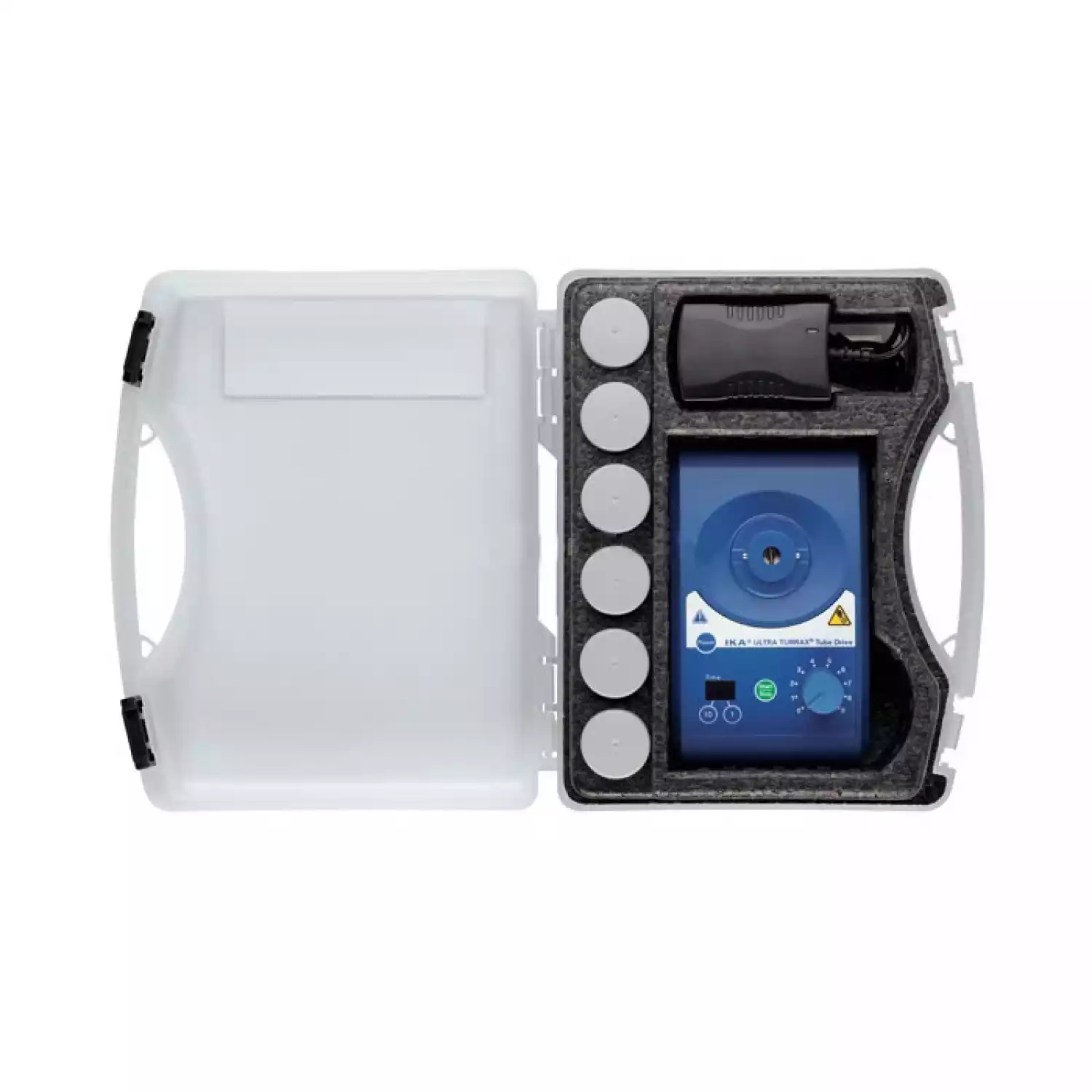 Рабочий комплект состоит из диспергатора ULTRA-TURRAX® Tube Drive, пробирки с мешалкой ST-20 (2 шт.), пробирки с элементом «ротор-статор» DT-20 (2 шт.), крючка для вынимания ротора-статора, пробирок для перемалывания со стеклянными (G) и стальными шариками (S) BMT-20 G / S (2 шт.) и блока питания.