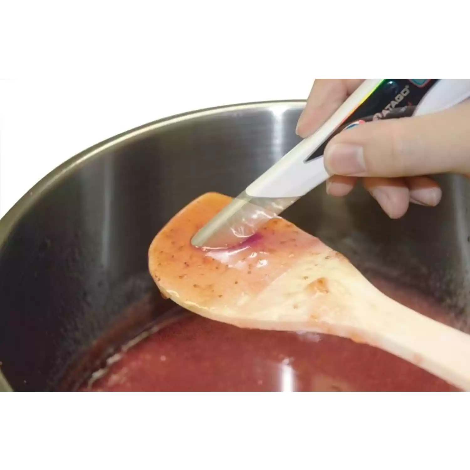 С помощью PEN-RI Вы можете проводить измерения двумя способами. Либо погрузить кончик прибора в пробу и нажать клавишу START ИЛИ нажать клавишу START и коснуться кончиком прибора пробы. Это новая функция для проведения измерений в непрерывном режиме. Теперь не надо ждать, пока образец для измерения остынет! Снимайте показания образцов, когда вам удобно – даже если это горячий суп или соус!