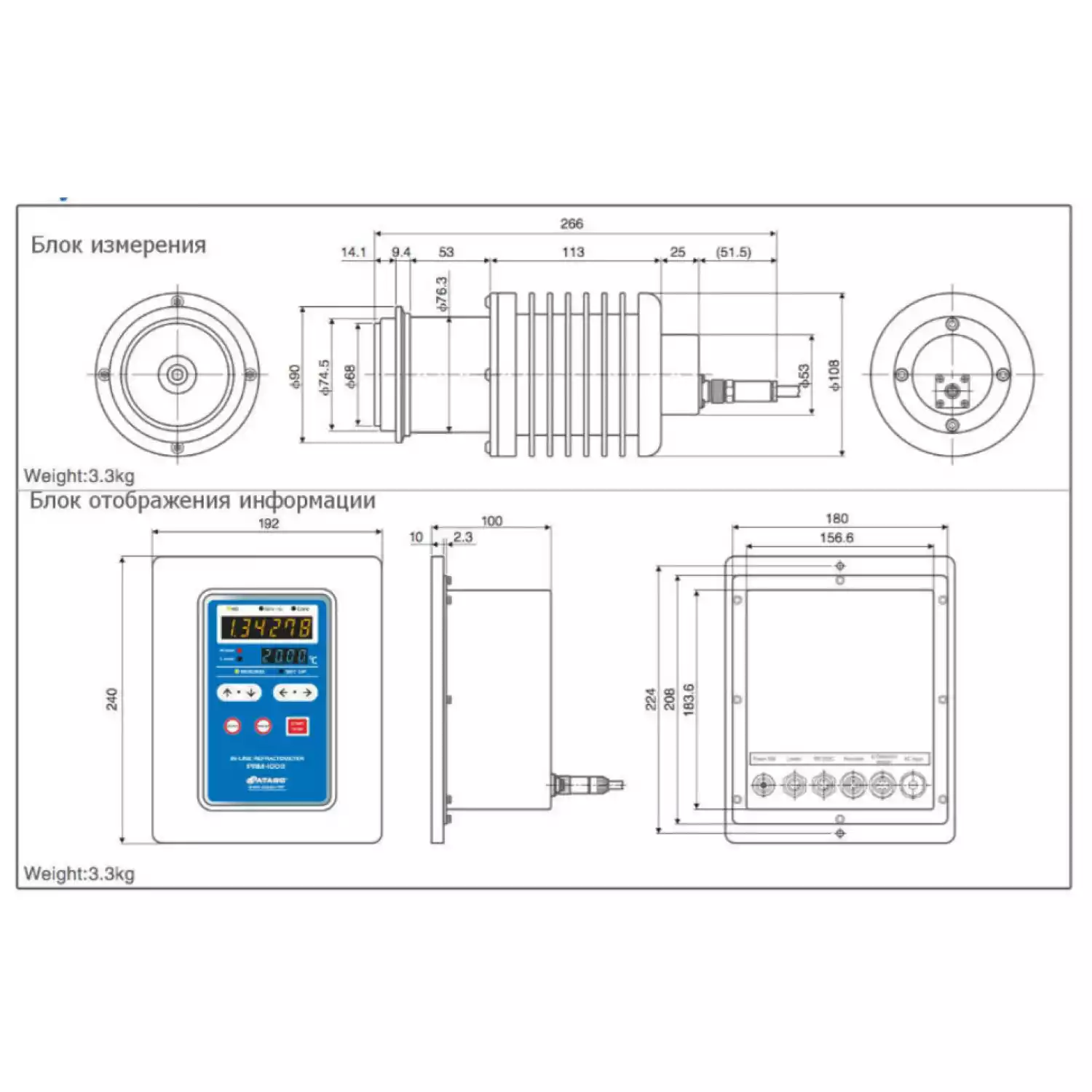 Прибор состоит из двух блоков. Первый — сам измерительный блок, который монтируется в трубу или бак при помощи специальных креплений (см. опции). Второй — блок отображения информации. Соединяются два блока кабелем длиной 15 метров или более. Призма измерительного блока выполнена из высококачественного искусственного сапфира и обладает стойкостью к механическим повреждениям и налипанию образца.