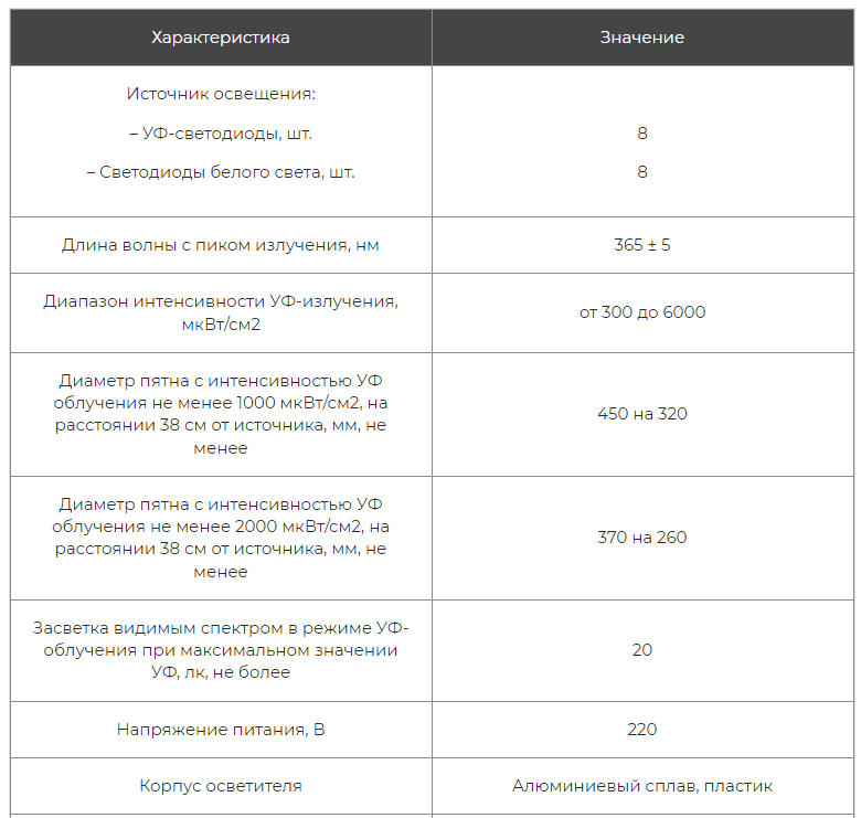 Уникальной особенностью светильника является возможность регулировки интенсивности видимого и УФ-света в соответствии с требованиями ГОСТ 18442-80. На текущий момент на рынке нет аналогичных технических решений.