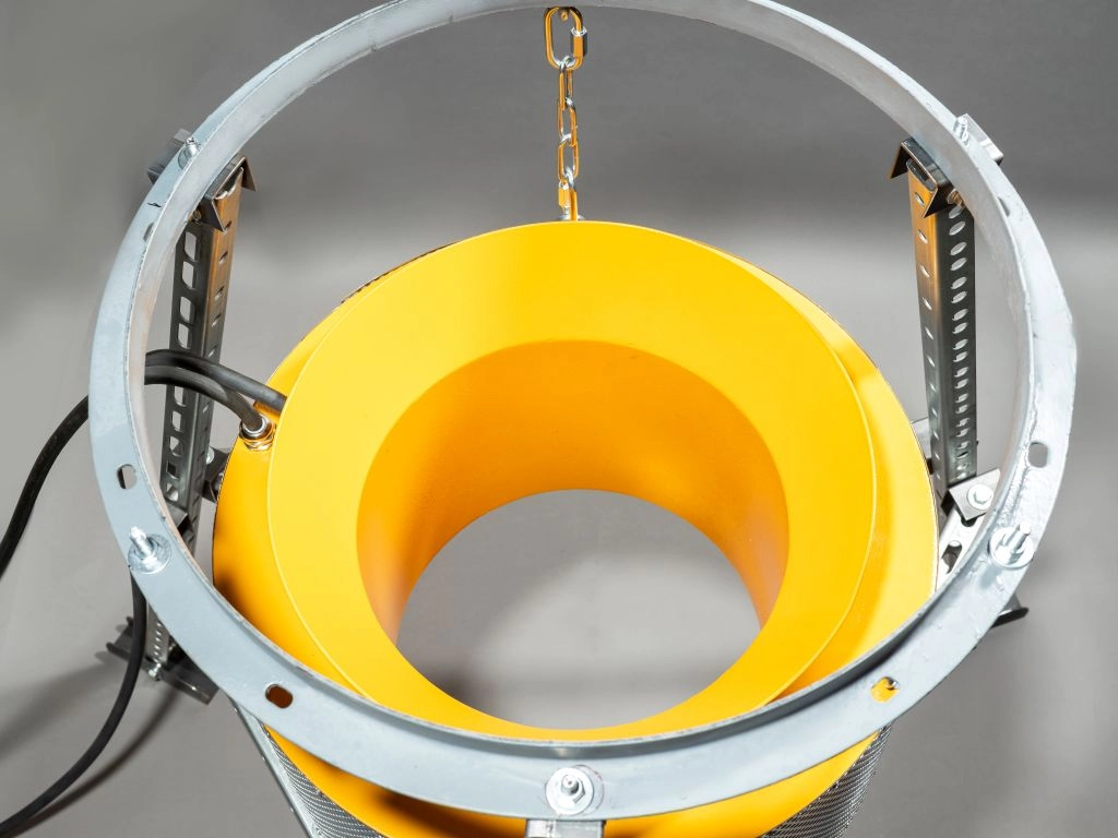 1) Корпус катушки (поз.1) предназначен для защиты обмотки от внешних воздействий, крепится к треноге с помощью гибких подвесов (поз.4), обеспечивающих ее свободное перемещение при прохождении внутри колонны. В верхней части катушки расположен конусообразный воротник (поз.2) для направления трубы внутрь катушки и предотвращения повреждения от резких ударов.