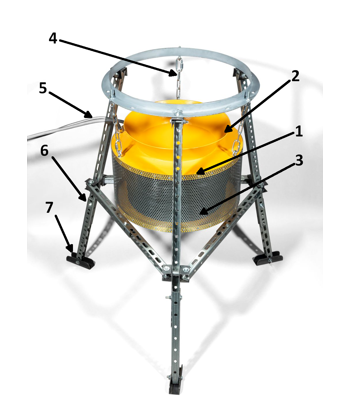 3) Тренога (поз.6) обеспечивает удобное позиционирование катушки на роторном столе скважины. Имеет регулировку высоты и ширины установки опор. На конце каждой опоры расположен подпятник (поз.7) для надежного расположения на роторном столе. Конструкция треноги обеспечивает быстрый доступ к стопорным клиньям без необходимости демонтажа размагничивающей катушки.