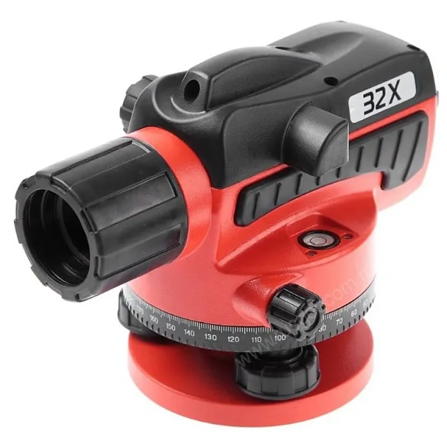 Оптика нивелира имеет 32-кратное приближение. Установлена просветленная оптическая система, которая облегчает выполнение работ в условиях недостаточной освещенности. Она дает в окуляре прямое изображение нивелировочной рейки, что облегчает выполнение замеров.