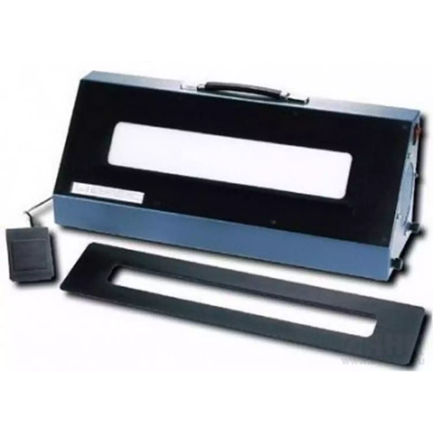 С 3×750 Вт галогеновыми лампами, управлением на фронтальной панели, выключателем с подсветкой, регулятором яркости, ножным выключателем и кабелем, присоединенным снаружи, 3 стекла теплозащитного фильтра, 1 опаловое (молочное) стекло и сдвоенный вентилятор. Максимальная плотность расшифровываемых снимков 3.7. Яркость ~ 50000 Кд/м² (Кд — кандела).