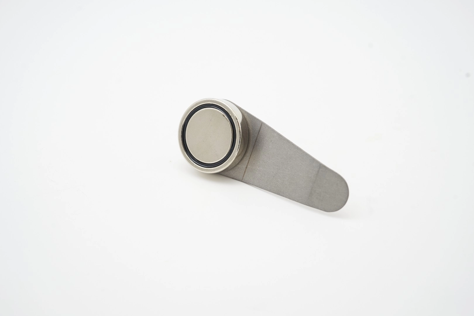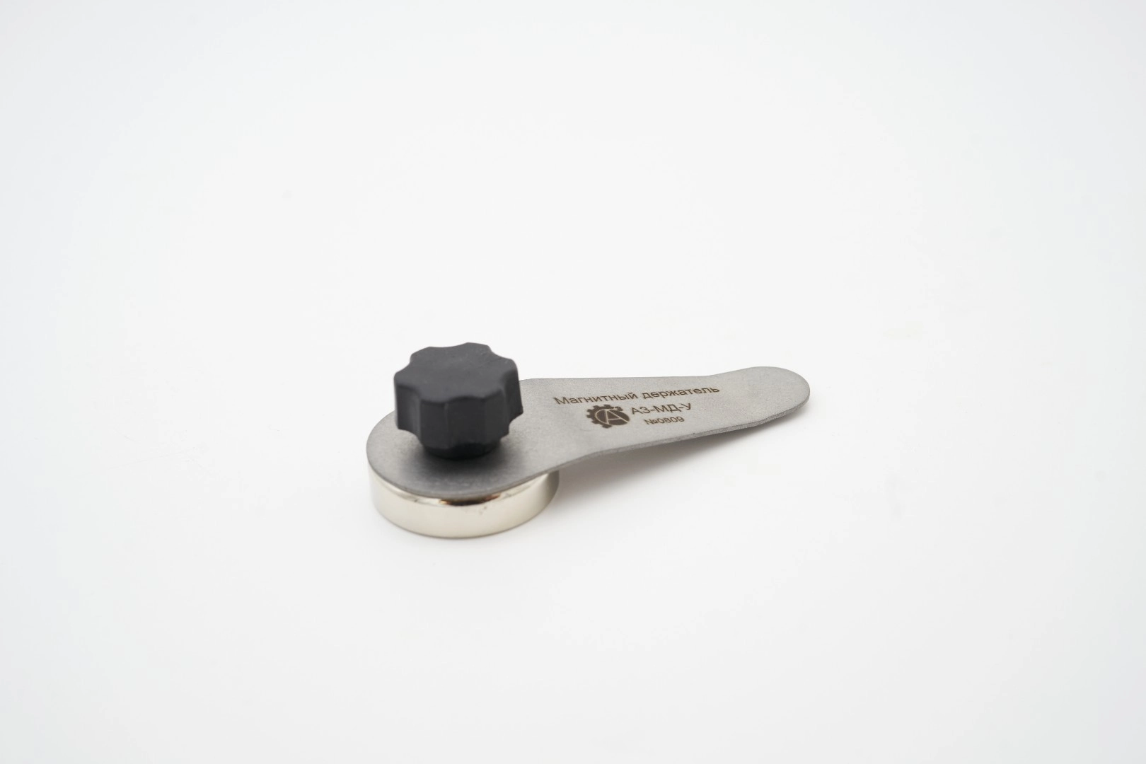 Магнитный держатель А3-МД малогабаритный с усиленными магнитными свойствами. Он состоит из металлического корпуса в виде «грибка», изготовленного из нержавеющей стали с магнитными свойствами, в нижней опорной части которого расположен высокоэнергети-ческий постоянный магнит на основе сплава Nd-Fe-B. Верхняя часть корпуса сделана для максимального удобства захвата рукой и отрыва от поверхности примагничивания. В ниж-ней опорной части находится пружинный прижим из нержавеющей пружинной проволоки, предназначенный для фиксации гибкой кассеты на месте проведения радиографической просветки.