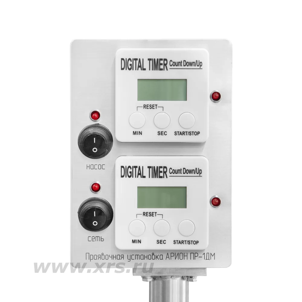 Для работы АРИОН ПР-1ДМ необходимо подключение к системам центрального водоснабжения и сточной канализации. Установка снабжена фильтром очистки водопроводной воды, циркуляционным насосом для перемешивания проявителя и двумя таймерами, с помощью которых контролируется время проявления и фиксации. Для корректировки положения установки «по уровню» используются регулировочные опоры.