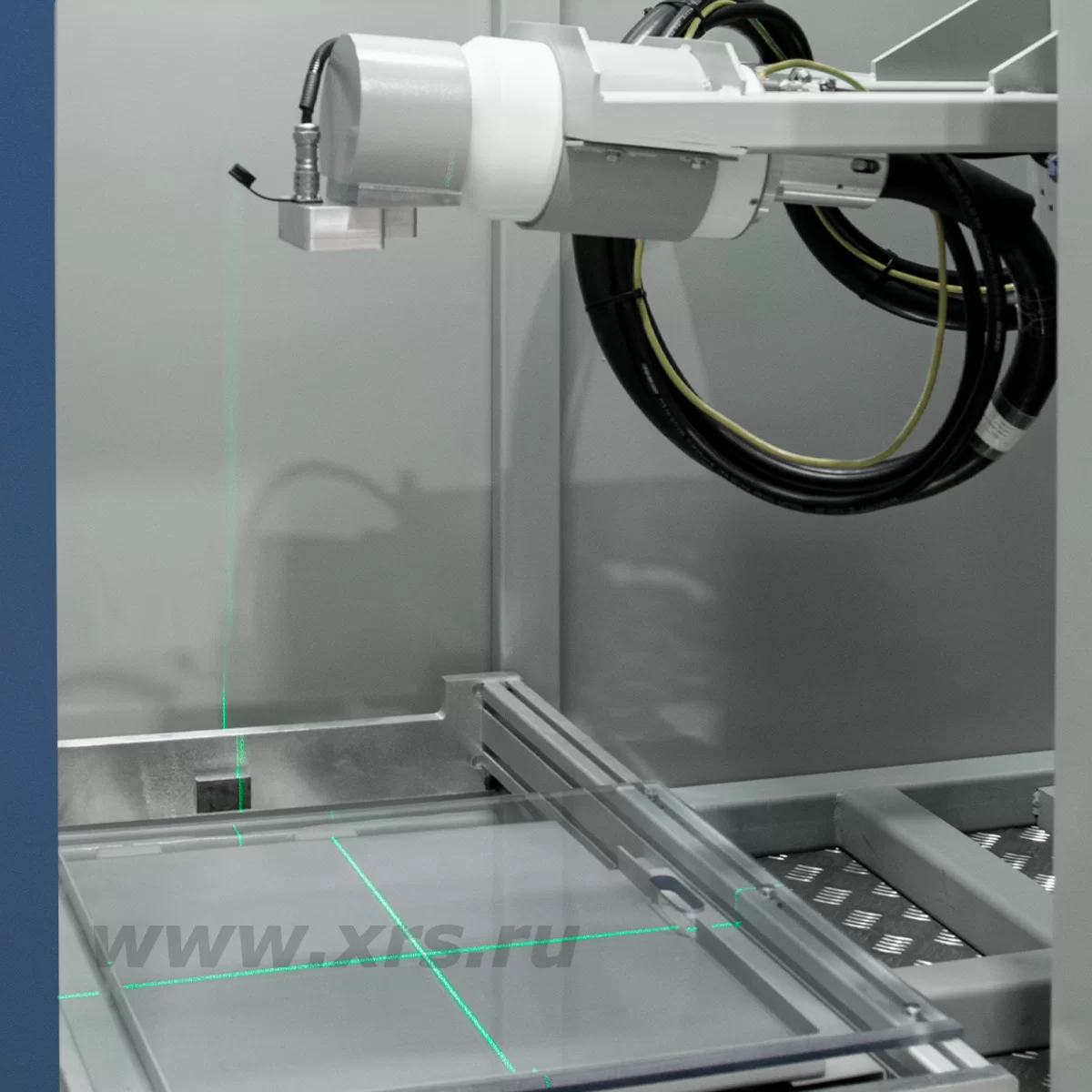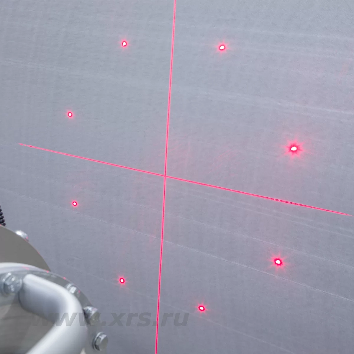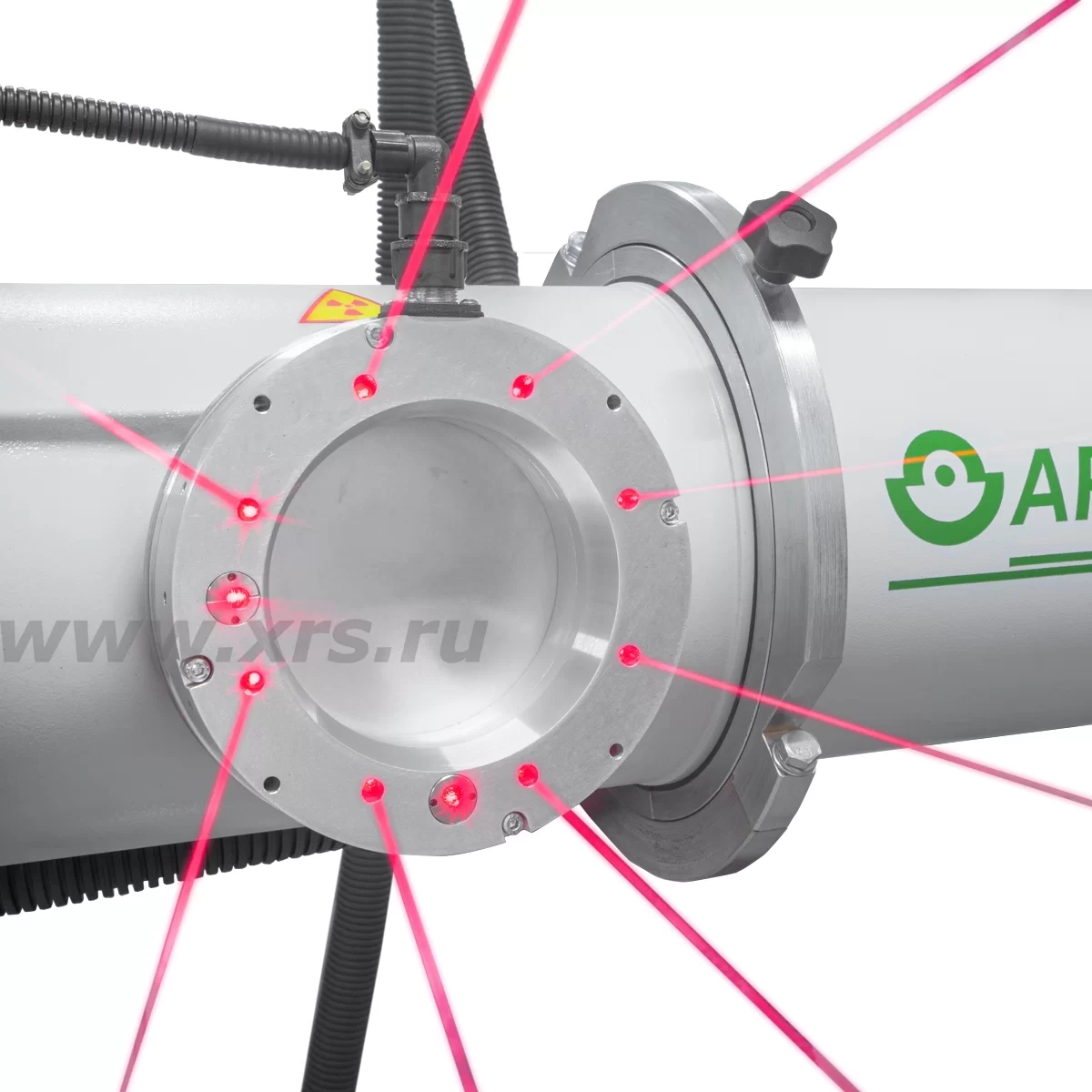 является наличие 8 дополнительных точечных лазеров, которые показывают условную область проекции пучка излучения на объекте контроля. Благодаря такому контуру перед проведением экспозиции возможно визуально оценить зону покрытия рентгеновского излучения. Два основных лазерных модуля формируют центр проекции пучка излучения в виде перекрестия лазерных лучей. Основные и дополнительные лазеры работают одновременно.
