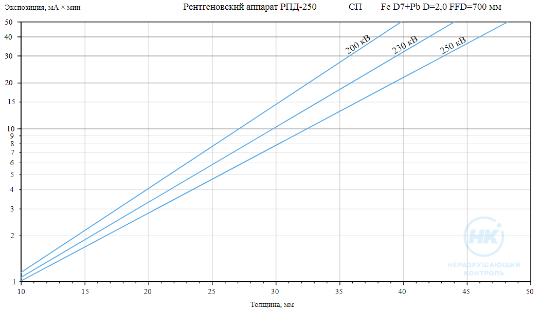 | Толщина просвечивания по стали, при условияхAgfa D7+Pb, D=2, F=700 мм, 10 мин | до 45 мм | до 45 мм |