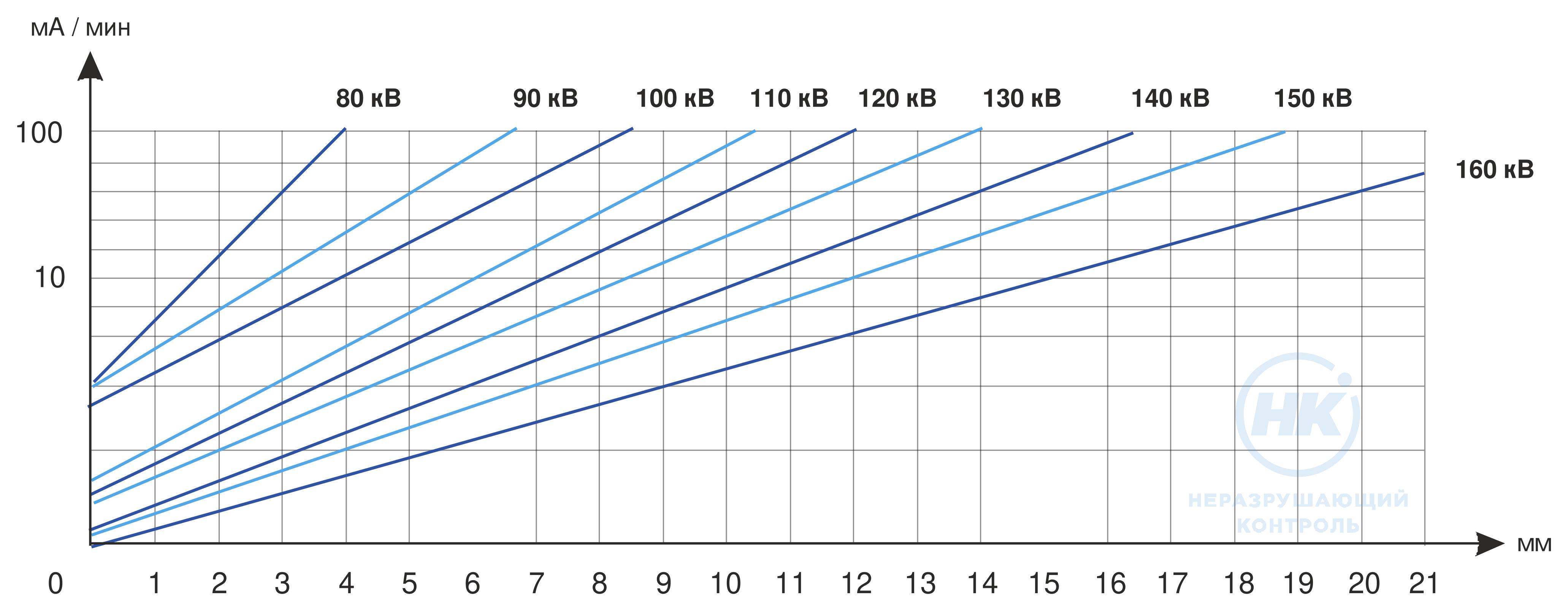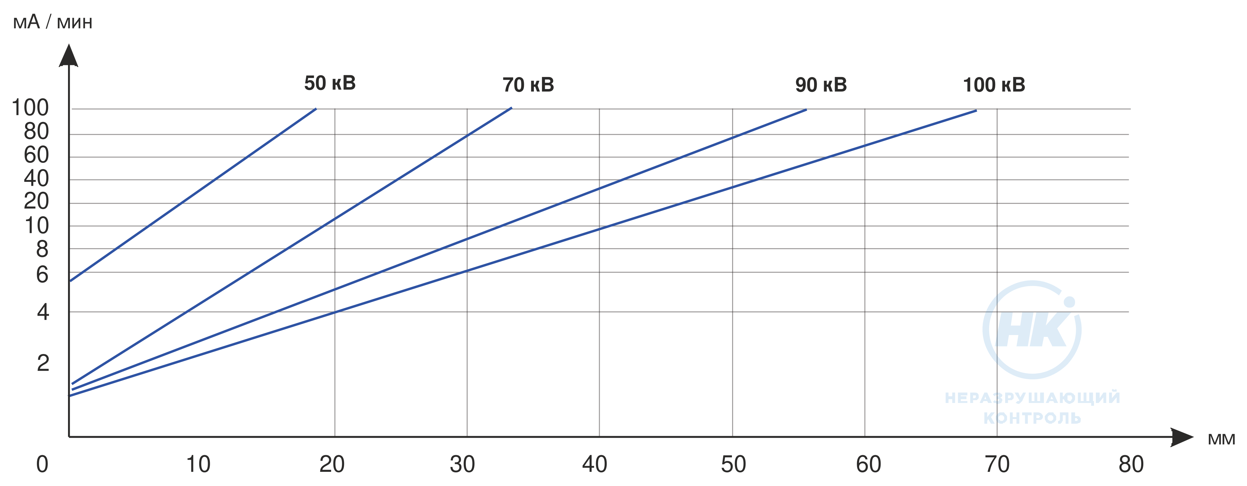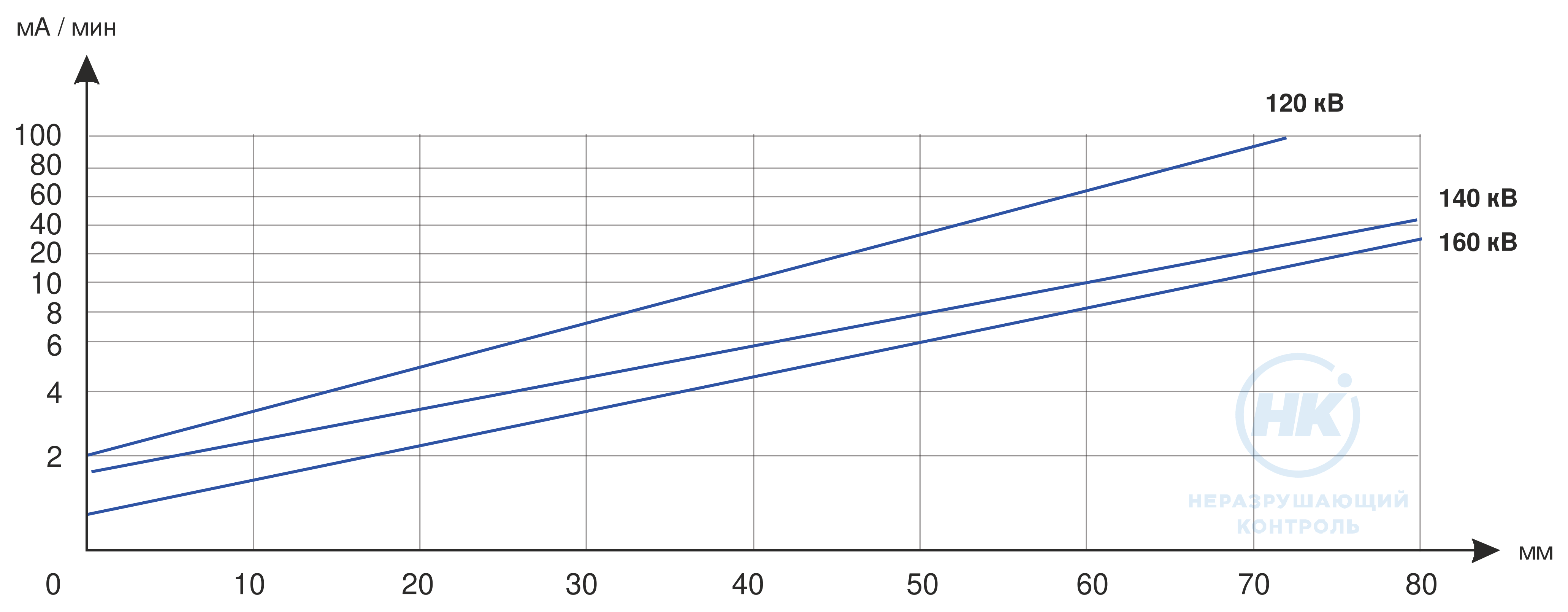 | Номинальная толщина просвечивания (Fe) | 11 мм при условиях: F=700 мм, D=2, плёнка типа D7 со свинцовыми усиливающими экранами 0,05-0,09 мм, время экспозиции 300 с, автом. обработка, G135, +26,5 °С, цикл6,5 мин |