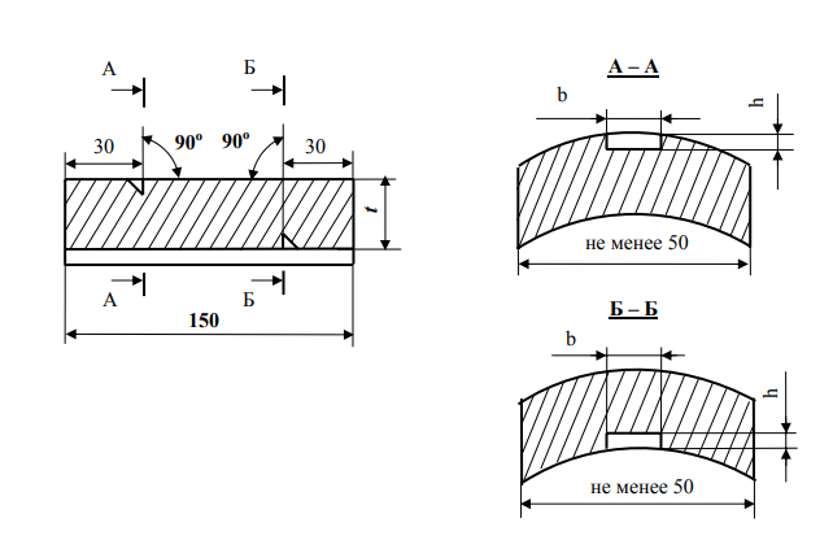 Нахлесточные образцы с нахлесточным сварным швом и отражателями типа «зарубка» применяются для настройки чувствительности и длительности развертки дефектоскопов при контроле сварных соединений и основного металла преобразователями типов П121 и П122 в соответствии с требованиями РД-25.160.10-КТН-016-15.