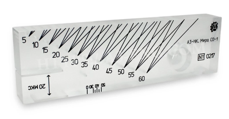 Мера СО-1 изготавливается из оргстекла и используется для определения условной чувствительности дефектоскопов при работе с пьезоэлектрическими преобразователями в диапазоне частот от 1,25 до 5,0 МГц. Дополнительно она применяется для проверки разрешающей способности и оценки точности глубиномера. Также можно проверять лучевую разрешающую способность наклонного ПЭП, пропил на торцевой части – для проверки точности глубиномера при работе с прямым ПЭП, разрешающую способность прямых ПЭП.