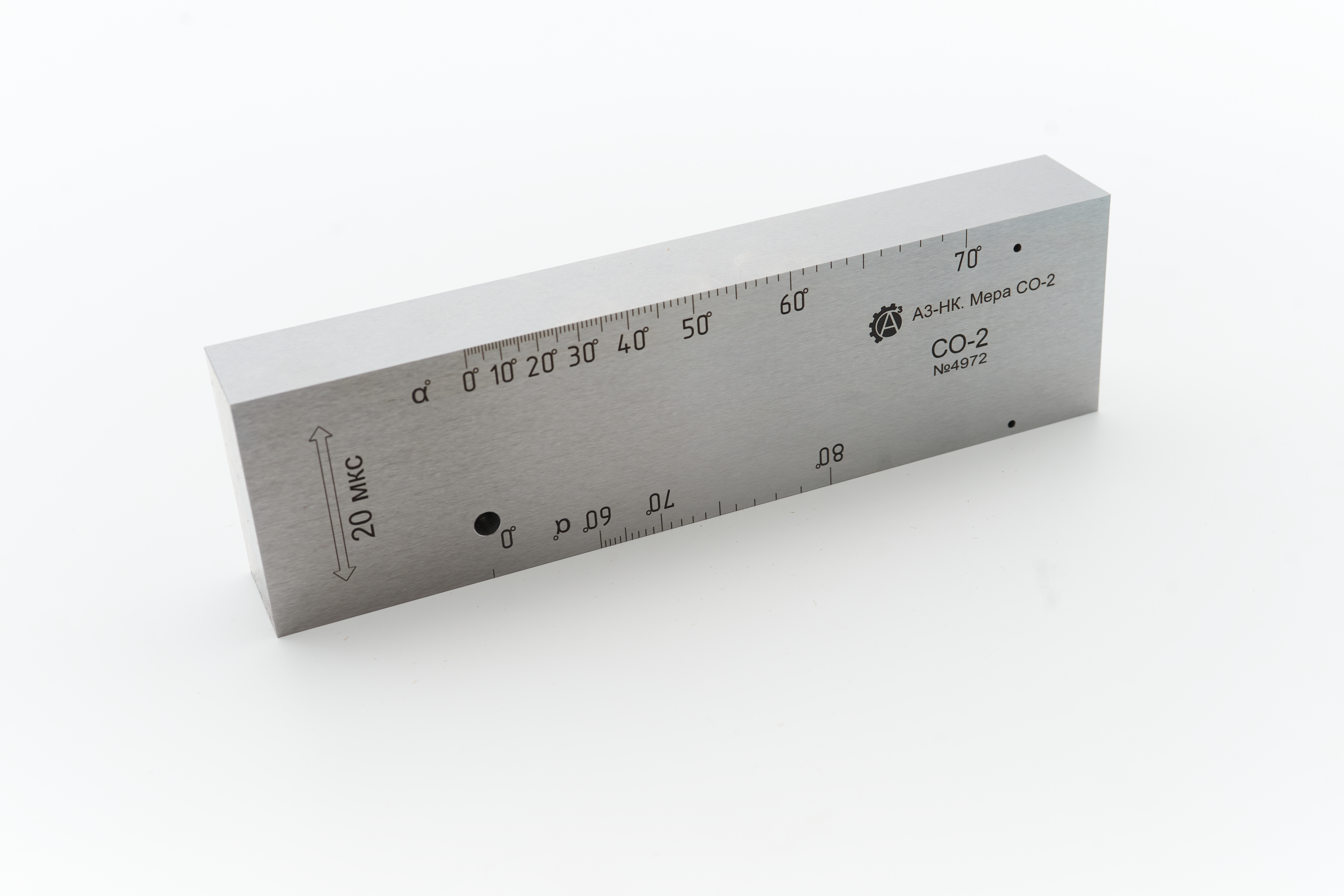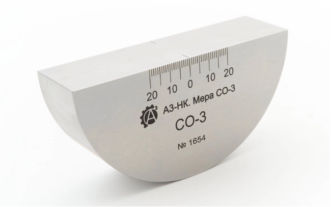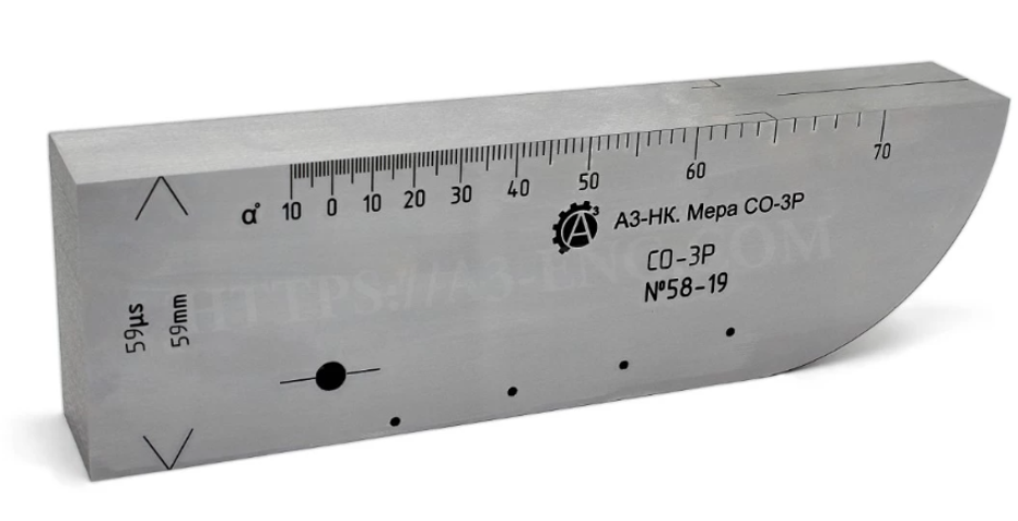Мера СО-3 применяется для определения точки выхода ультразвукового луча и стрелы наклонного преобразователя. Помимо этого, данный калибровочный образец используется для проверки предельной чувствительности дефектоскопа по опорному сигналу, формируемому от закругления, радиус которого составляет 55 мм.