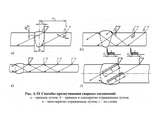 Угол ввода колебаний должен быть таким, чтобы расстояние между искателем и швом было как можно меньше, а направление луча было как можно ближе к нормальному. Это обеспечит максимальную площадь возможных дефектов. Таким образом, двойной или многократно отраженный луч используется в тех случаях, когда размеры валика для усиления шва не позволяют проверить шов прямым или однократно отраженным лучом при оптимальном угле ввода луча.