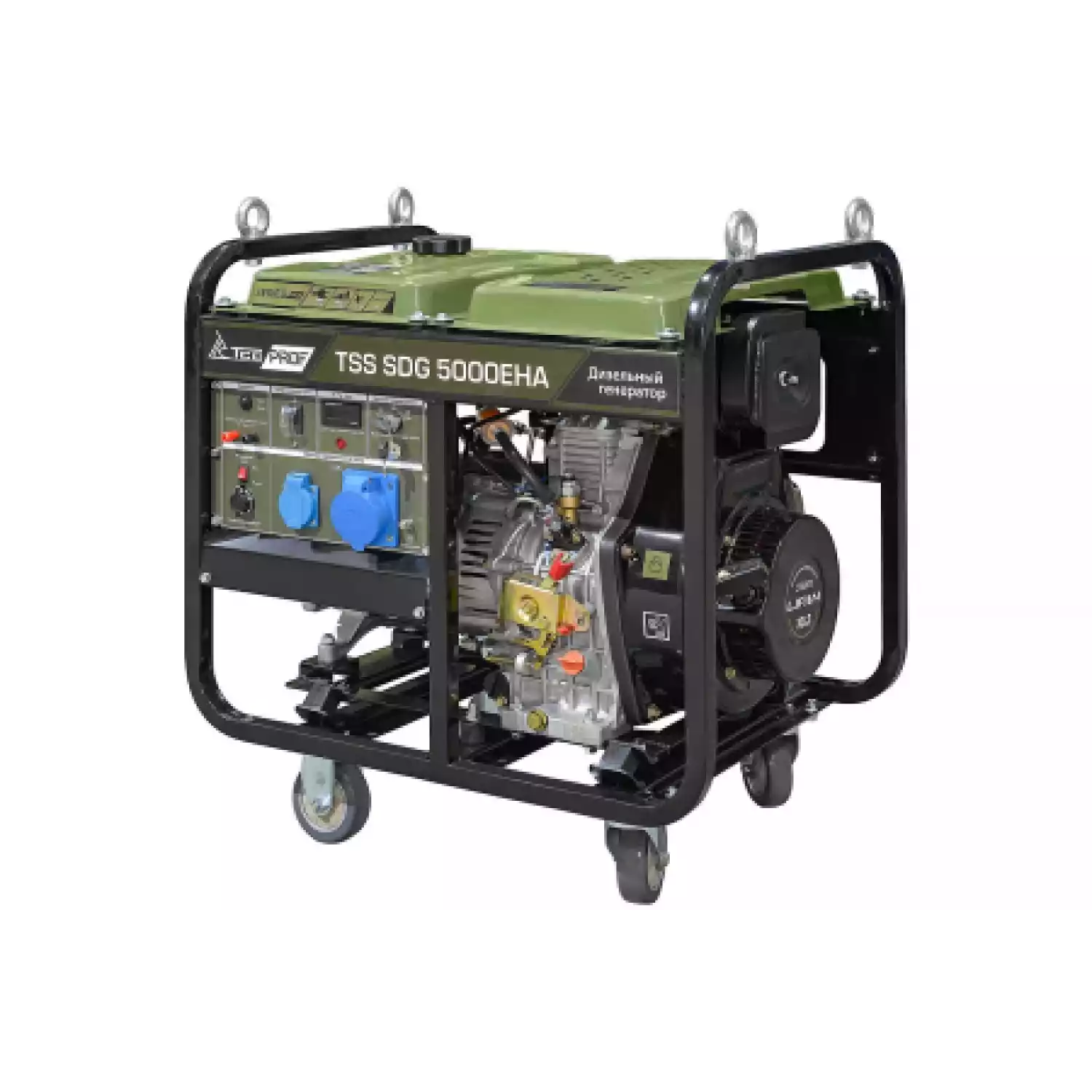 Дизель генератор с электростартом и разъемом для подключения блока автоматики.TSS SDG 5000EHА предназначен для выработки электроэнергии с основными характеристиками: напряжение - 220 вольт, частота 50 Гц и номинальной мощностью 5 кВт, оснащенный колесным комплектом для удобства передвижения.