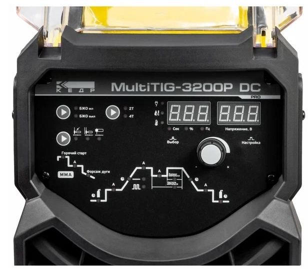 Установка аргонодуговой сварки КЕДР MultiTIG-3200P DC (380В) — мультифункциональное устройство, способное решать сложнейшие производственные задачи. Расширенный режим TIG даёт сварщику возможность настройки таких параметров, как форма волны переменного тока, частота (до 999 Гц) и скважность импульса в режиме DC, баланс полярности и частота переменного тока. Полноценный ММА режим позволяет осуществлять тонкую подстройку динамических характеристик дуги регулировкой показателей HotStart и ArcForce, что обеспечивает максимально качественный процесс при сварке самых ответственных конструкций. Сварочный ток 320А, показатель ПВ 100% и высокая степень защиты электронных компонентов позволяют использовать MultiTIG-3200P DC в качестве основного промышленного инструмента в судостроительной, оборонной и космической промышленностях. Аппарат может быть укомплектован проводной и беспроводной педалью, беспроводным пультом дистанционного управления, дублирующим панель управления, и проводным пультом дистанционного управления для ММА-режима.