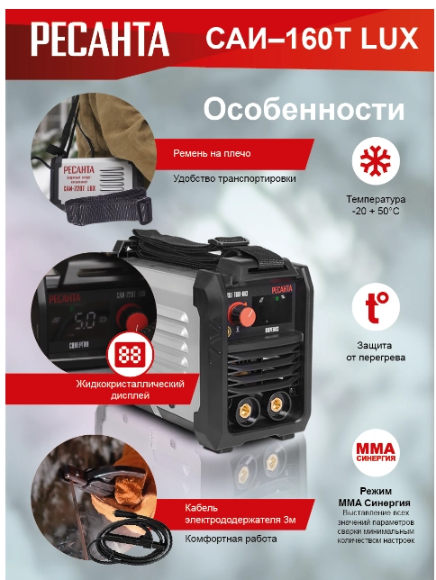 САИ-160T LUX — предназначен для ручной дуговой сварки штучным покрытым электродом на постоянном токе и электродом с рутиловым и основным покрытием (режим ММА). Сварочные аппараты разработаны на базе IGBT транзисторов.