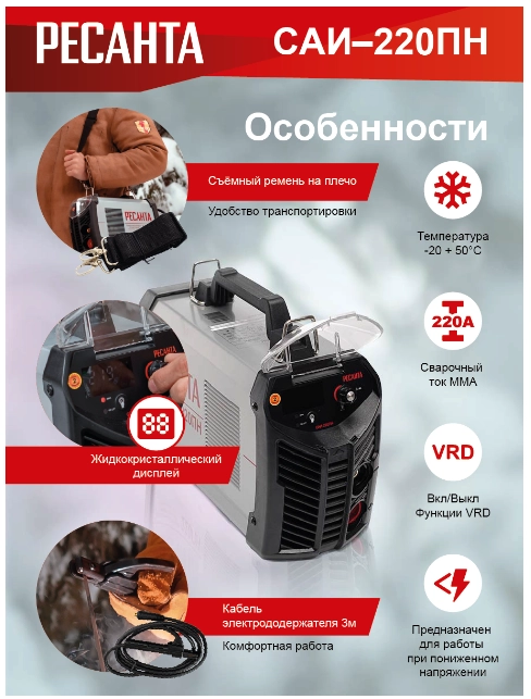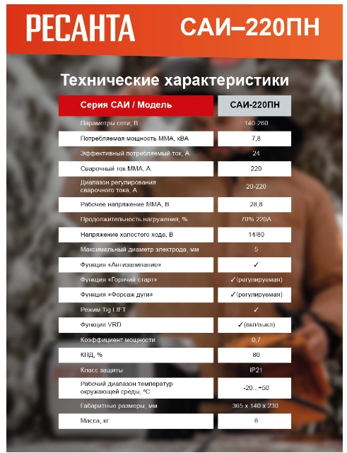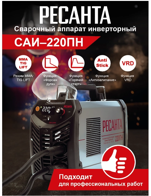 Сварочный аппарат сери САИ-220 ПН «Ресанта» предназначен для ручной дуговой сварки штучным покрытым электродом на постоянном токе и электродом с рутиловым и основным покрытием (режим ММА) и сварки постоянным током неплавящимся электродом в среде защитного газа углеродистых и нержавеющих сталей (режим TIG LIFT). Сварка осуществляется постоянным током в среде аргона.