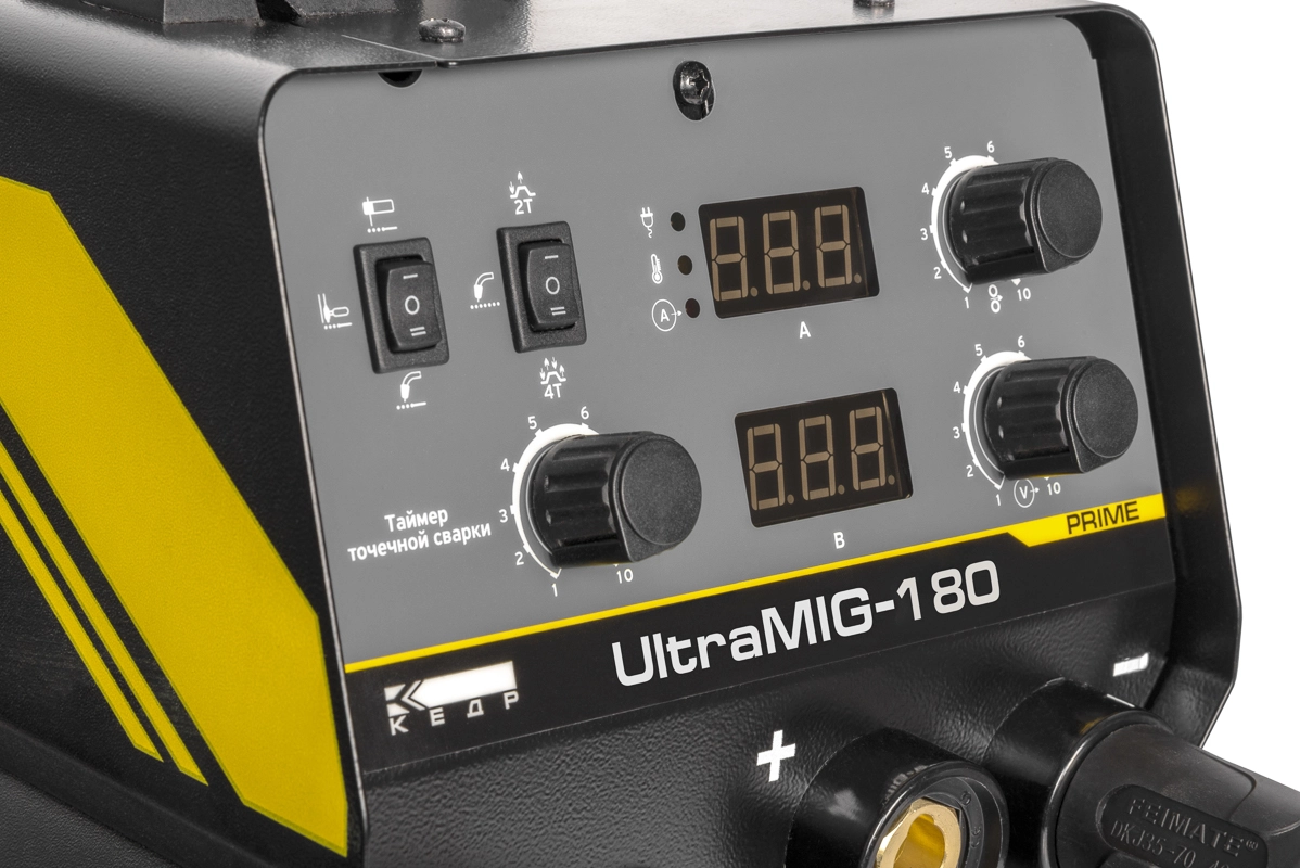 Полуавтомат КЕДР UltraMIG-180 (220В, 30-180А) — предназначен для сварки на малых и средних предприятиях, частных мастерских, а также для использования в домашних хозяйствах. Аппарат выполнен на современных IGBT-модулях, надежно защищенных силовой частью, а высокопрочный металлический корпус позволяет использовать его в тяжелых промышленных условиях. Цифровая панель с дисплеями значительно упрощает работу с данным аппаратом и позволяет снизить классификацию сварщика без потери качества сварки.
