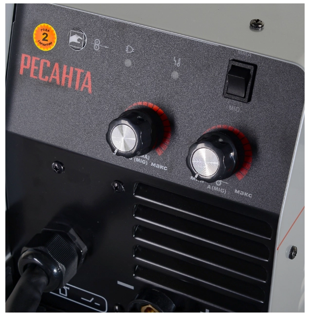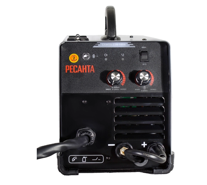 Для защиты прибора Ресанта САИПА-22В/160А от перегрева при длительной эксплуатации аппарата на максимальном токе, внедрено автоматическое отключение со световой индикацией. На панели предусмотрены регуляторы основных параметров: скорость подачи проволоки, регулирование напряжения, величины сварочного тока, в диапазоне от 30 до 160 Ампер.