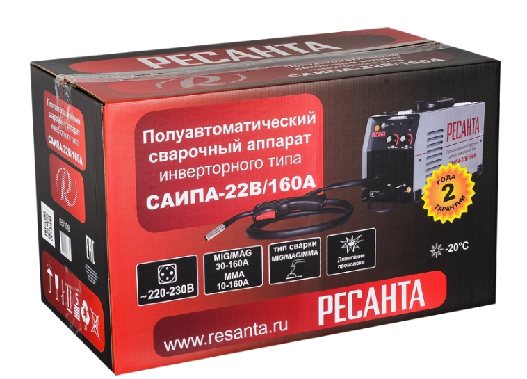 Полуавтомат Ресанта САИПА-22В/160А работает от стандартной однофазной сети питания 220 Вольт. В конструкции применены основные функции, формирующие высокое качество ключевых параметров сварной ванны: антиприлипание, прогон проволоки на холостом ходу (обеспечивает моментальную очистку сопла горелки), опция FCAW (сварка без газовой среды – методом МIG MAG, с применением порошковой проволоки).
