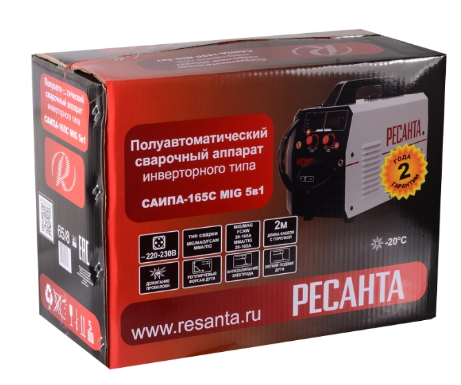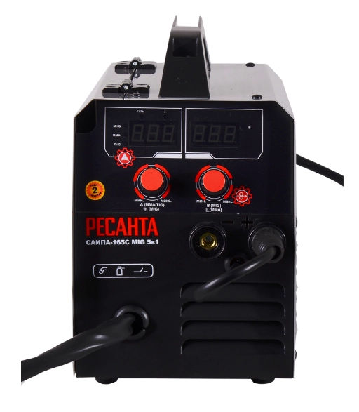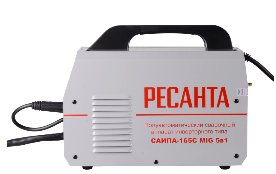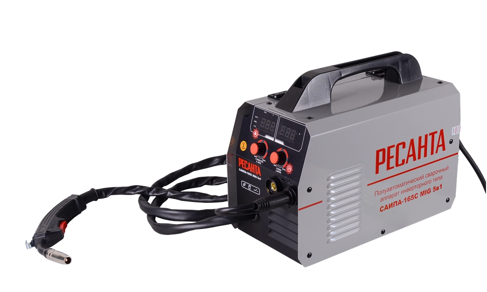 Полуавтоматический сварочный аппарат Ресанта 165С серии САИПА – многофункциональный инверторный источник питания постоянного тока, предназначенный для ручной электродуговой сварки покрытым электродом (метод ММА), а также проволокой в инертной или активной газовой среде (MIG MAG сварка).