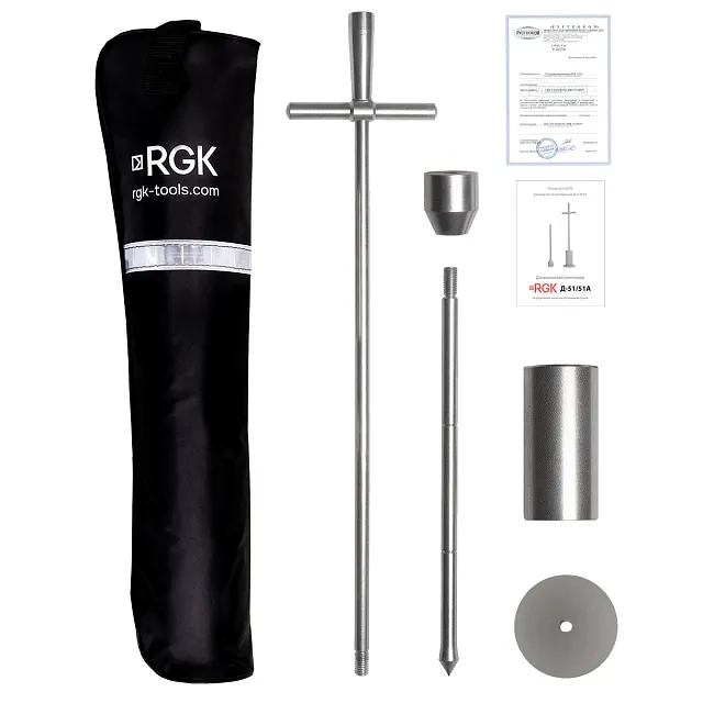 Ключевое отличие плотномера динамического RGK Д-51А от базовой версии — наличие в комплекте штампа диаметром 100 мм, который необходим для замеров на влажных глинистых грунтах, и для реализации метода двойного зондирования, который применяется при контроле уплотнения без проведения измерения влажности. В этом случае глинистый грунт испытывают в двух состояниях: исходном и после дополнительного уплотнения.