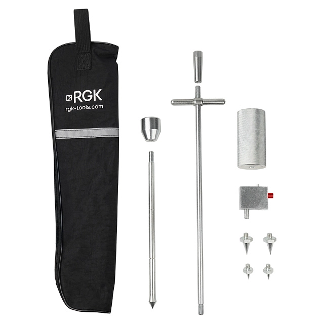 Для работы с различными материалами динамический плотномер RGK ДПУ оборудуется съемным рабочим узлом. Для сыпучих материалов и грунта используется стержень с наконечником, а для асфальтобетонных смесей – конусная насадка на ограничителе.
