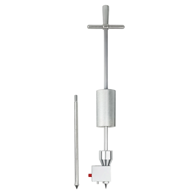Оценка качества укладки асфальтобетона может производиться в горячем состоянии в процессе выполнения работ, а также через несколько суток, после полного остывания материала. Для этих целей инструмент оснащается сменными конусами двух типоразмеров, отличающихся высотой. Предельное заглубление заостренного элемента в поверхность покрытия фиксируется механизмом с пружинным затвором, который встроен в ограничитель, что минимизирует риск субъективных ошибок пользователя.