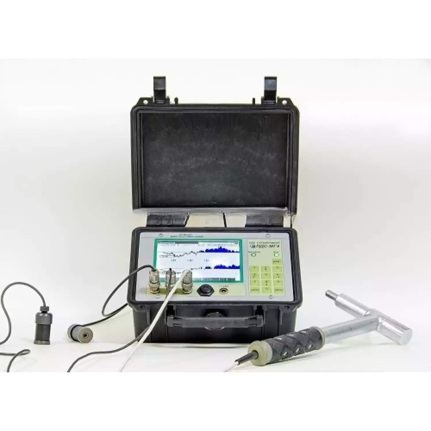 Прибор состоит из электронного блока, размещенного в ударопрочном корпусе фирмы PELI, из одного или двух (в зависимости от комплектации) сейсмоприемников, молотка с демпфером. По спецзаказу поставляются: молоток со встроенным пьезодатчиком для контроля силы удара; приспособления для установки датчиков на грунт; темпер для возбуждения упругих волн в грунте.