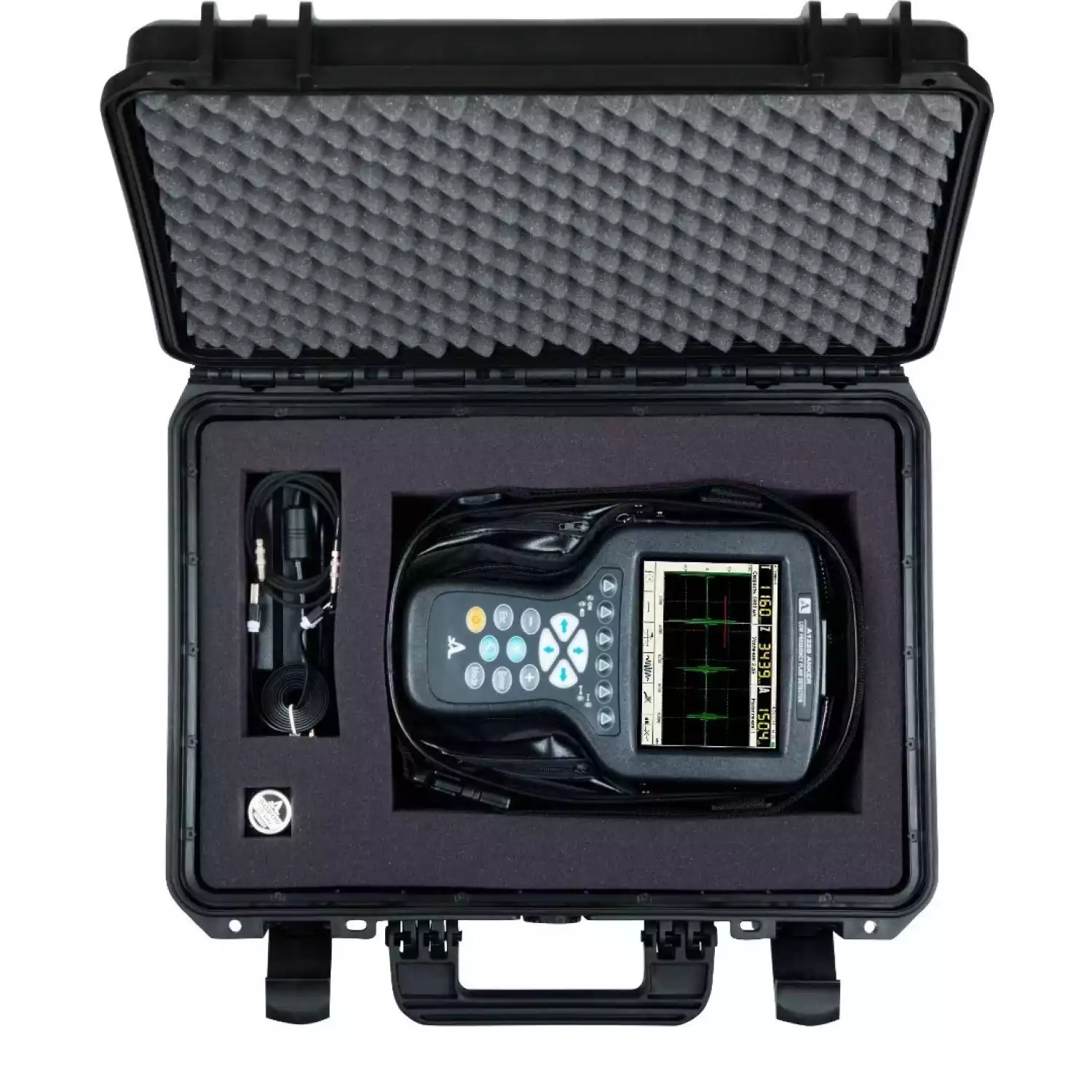 Дефектоскоп представляет собой компактный электронный блок с большим высококонтрастным цветным TFT дисплеем и клавиатурой. На дисплее отображаются результаты измерений в виде А-скана сигнала. С помощью одинарного кабеля LEMO-LEMO к электронному блоку подключается низкочастотный ультразвуковой прямой совмещенный преобразователь продольных волн S0205 0.025A0R20Х20CL. Данный преобразователь имеет центральную рабочую частоту 25 кГц, широкую полосу пропускания (не менее 100%), а также жидкостный тип акустического контакта.