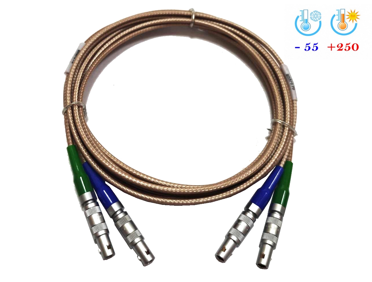 Коаксиальный соединительный кабель 2Lemo 00-2Lemo 00 с расширенным температурным диапазоном предназначен для эксплуатации в условиях как низких температур (до -55С), так и применений для контроля нагретых объектов (до 250С).