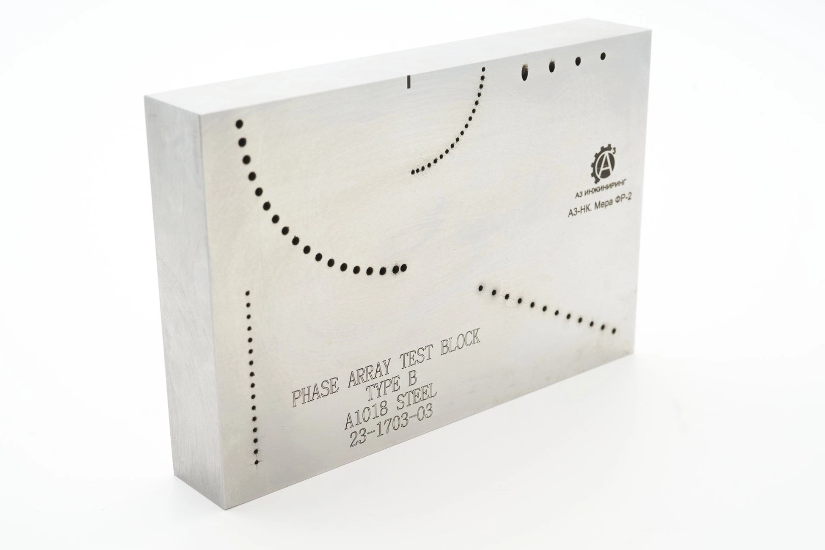 Меру ФР-2 применяют для настройки параметров развертки дефектоскопа на фазированных решетках, настройки уровней чувствительности, а также для оценки мертвой зоны, разрешающей способности и определения точки выхода луча многоэлементного преобразователя.
