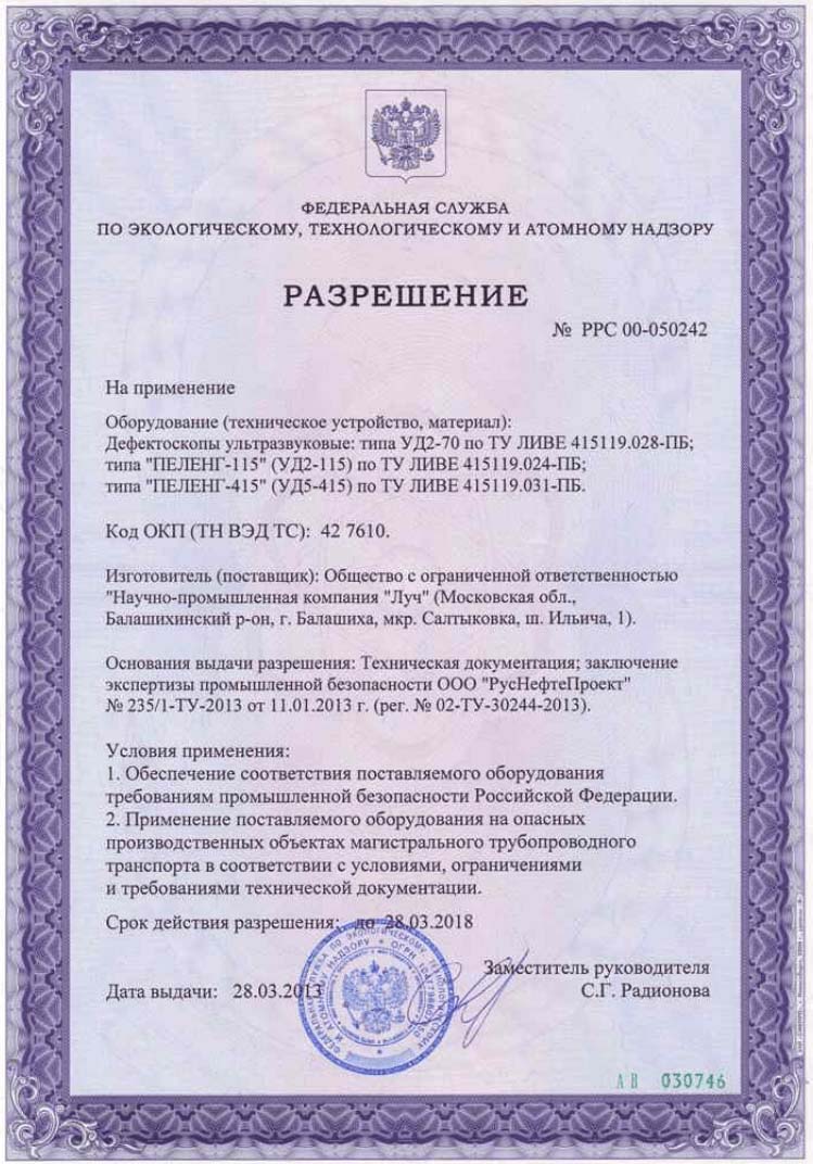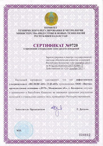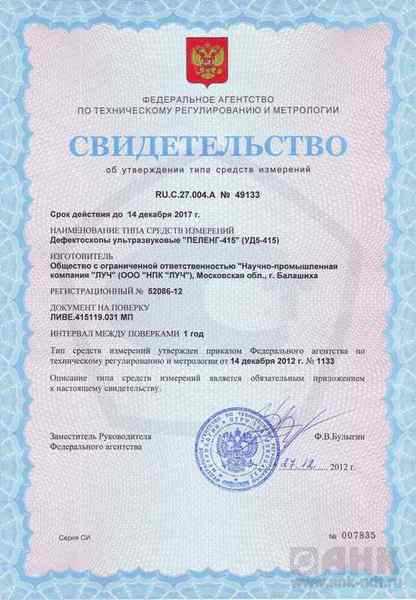 | 1 | Дефектоскоп ультразвуковой «Пеленг-415» (УД5-415) (электронный блок) | 1 шт. |
