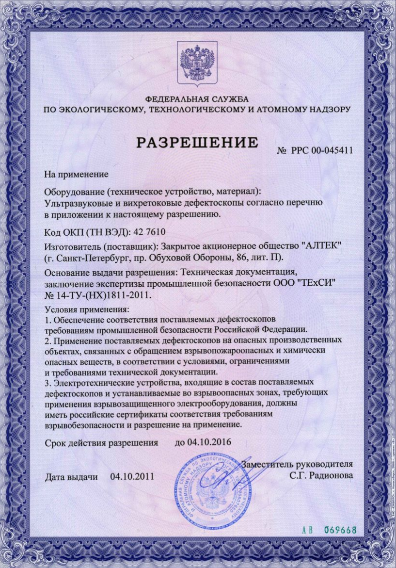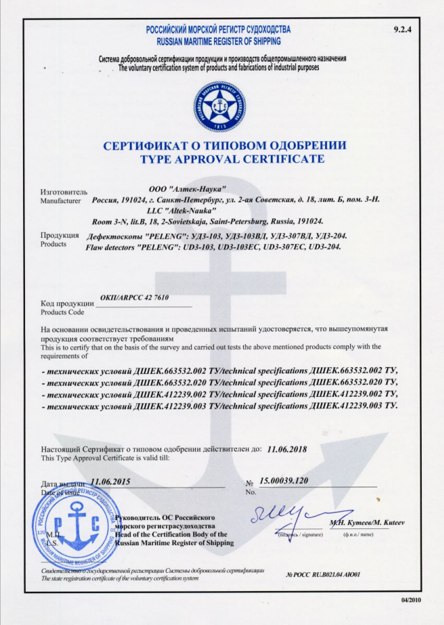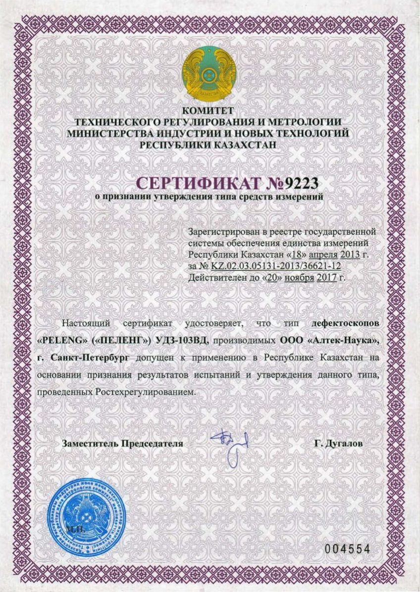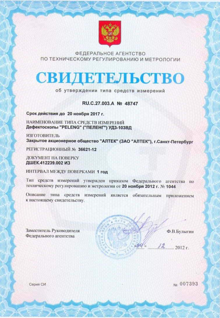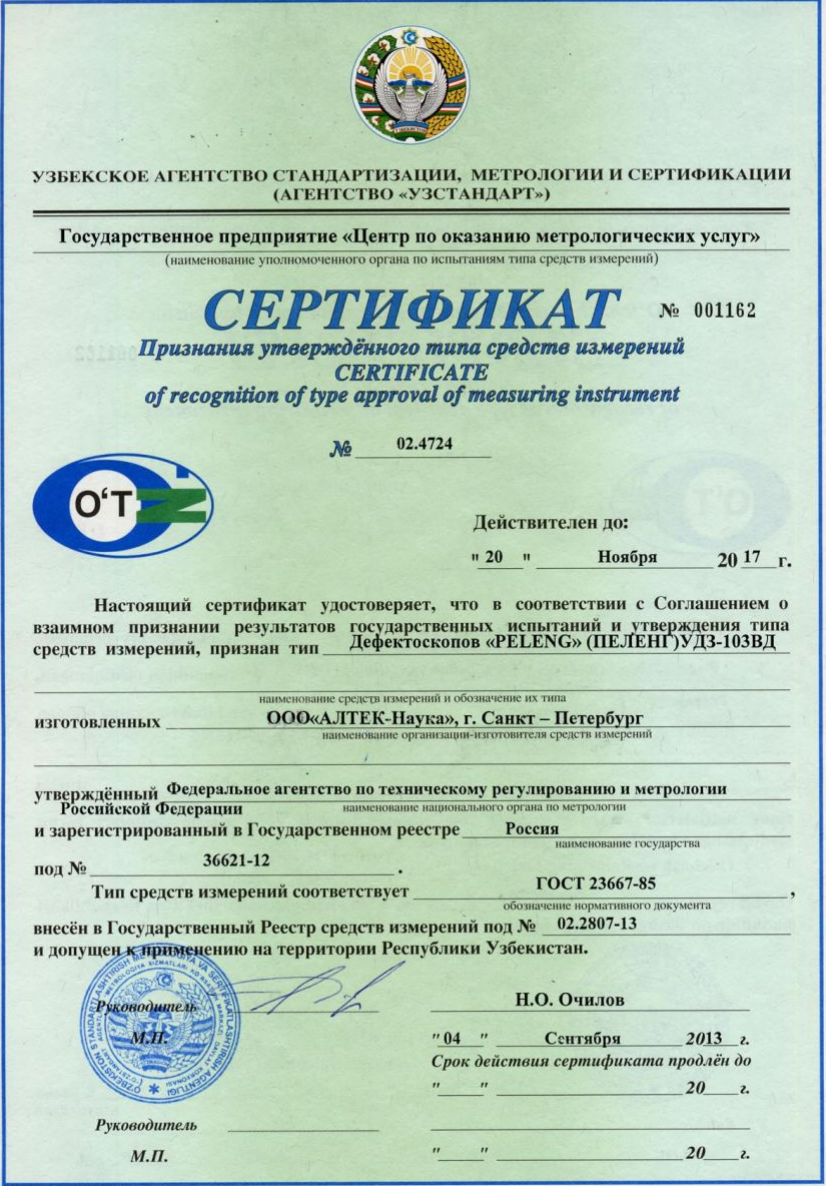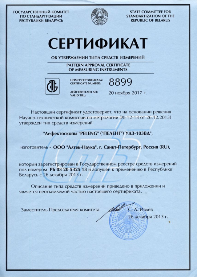 Устройство для обнаружения неисправностей УД3-103ВД, обладает способностью бесперебойно сохранять параметры настроек, данные осмотров и результаты проверок, при этом гарантируя их защиту кодами от неожиданных вмешательств, будь то изменение установок или их стирание. К тому же, предусмотрен шанс синхронизации данного аппарата с домашним компьютером для того, чтобы заносить данные о дефектации в обобщенную базу сведений. Все аппараты для обнаружения дефектов серии "PELENG" имеют официальный допуск для операций неразрушающей проверки в пределах России, Беларуси и Казахстана.