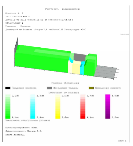 При толщинометрии производится измерение значений толщины каждым из четырех ПЭП, входящих в акустический блок. Толщинометрию проводят сканированием по контролируемому участку акустическим блоком. Результаты контроля просматриваются на экране дефектоскопа, а подключив к дефектоскопу принтер — можно их распечатать. По результатам контроля оценивают качество всего сварного соединения в соответствии с нормативными документами, или в соответствии с методикой применения УИУ серии «СКАНЕР» для УЗК сварных соединений и основного металла трубопроводов, сосудов, металлоконструкций СКАН 2.00.00.000.М и СКАН 2.01.00.000.М, утвержденных Ростехнадзором РФ. Результаты контроля могут быть также перенесены в память внешней ПЭВМ, подключаемой к дефектоскопу.