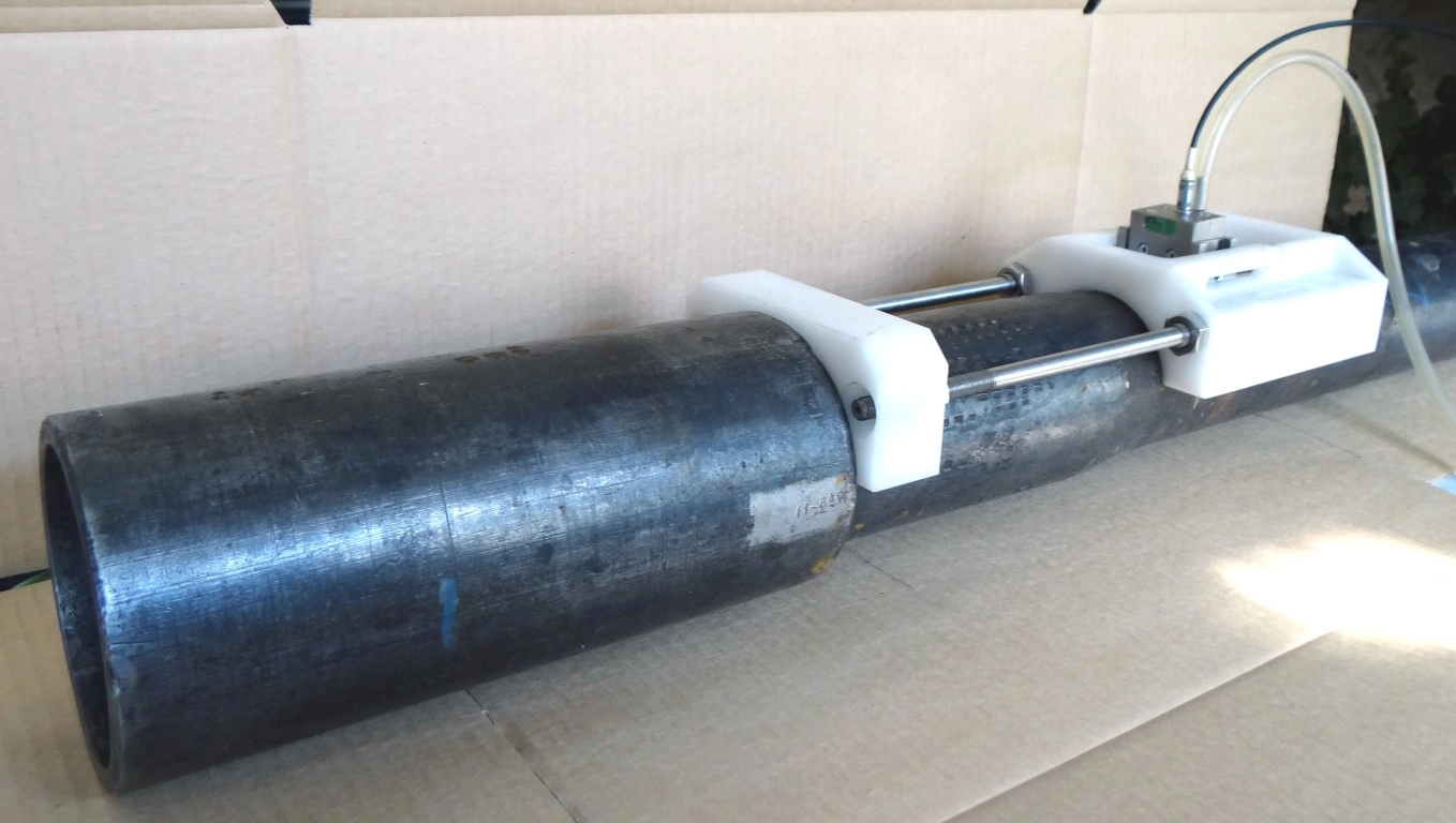 Сканирование кольцевого шва бурильной трубы и околошовной зоны осуществляется преобразователями щелевого контакта П321-5,0-75 ШБТУ с устройством позиционирования под соответствующий диаметр со стороны тела трубы на определенном расстоянии от упорного уступа. Контроль проводится за один оборот трубы.