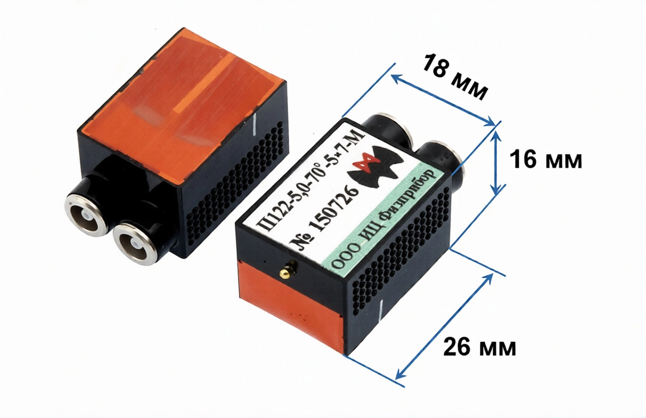 Малогабаритные наклонные раздельно-совмещённые ПЭП предназначены для контроля тонкостенных сварных швов из малоуглеродистых сталей, нержавеющих сталей, сплавов алюминия и титана. Размеры преобразователей 26×18×16 мм.