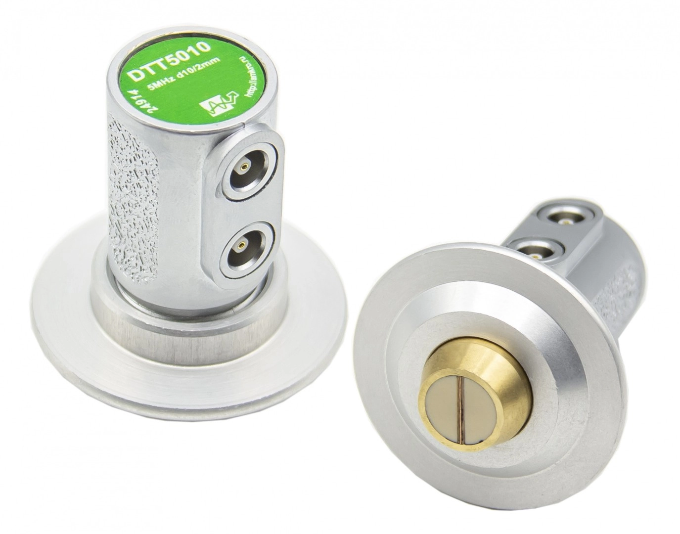 Преобразователь высокотемпературный прямой раздельно-совмещенный DTT5010 с призмой из высокотемпературного синтетического полимера предназначен для контроля поверхностей с температурой до 350 °С.