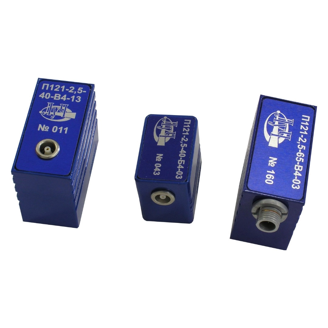 Преобразователи наклонные контактные совмещенные типа П121 предназначены для ультразвуковой дефектоскопии. Преобразователи могут быть изготовлены для любых типов дефектоскопов.В зависимости от размеров пьезоэлемента (ПЭ) преобразователи разделены на серии 1 .... 5 и изготавливаются в различных корпусах (Б и В). По умолчанию ПЭП поставляется с горизонтальным расположением разъема. Возможно индивидуальное изготовление ПЭП с вертикальным расположением разъема.